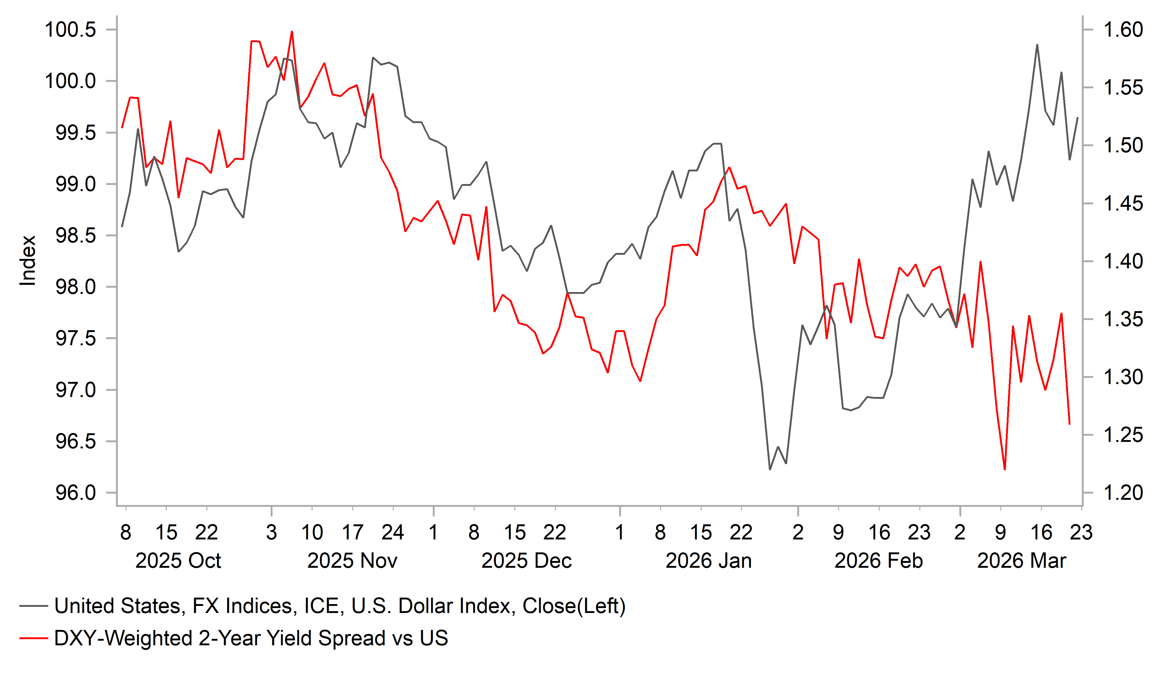 The US dollar has strengthened overnight resulting in the dollar index rising back closer to the 100.00-level after last week’s correction lower. The US dollar initially strengthened at the start of the Middle East conflict but failed to extend its advance over the past week. The US dollar’s upward momentum over the past week was dampened in part by the hawkish repricing of rate hike expectations outside of the US. European rate market have moved to price in multiple rate hikes from the BoE (click here) and ECB (click here) after their latest policy updates. Market participants expect European central banks to tighten policy in response to the energy price shock more than the Fed contributing to yield spreads moving against the US dollar. However, even the US rate market is now starting to anticipate rate hikes from the Fed as well. There are currently around 15bps of Fed hikes priced in by year end which compares to around 80bps for the BoE and ECB. We remain unconvinced that yield spreads will be the main driver of FX performance if the energy price shock continues to intensify, and still expect the US dollar strengthen as economies outside of the US in Asia and Europe will be hit harder as stagflation risks continue to build.