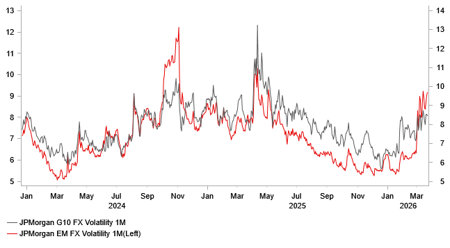 President Trump’s decision to step back from striking energy infrastructure in Iran for at least five days to allow for negotiations with Iran, has helped to reduce the immediate risk of further damage to energy sites in the Middle East. Iran had threatened to retaliate by launching further attacks on energy sites in the Middle East. However, it remains highly uncertain if the talks will prove successful and bring a quicker end to the conflict. For financial markets what matters most is whether energy supply is able to normalize through the Start of Hormuz. It currently remains effectively closed which if not resolved in the coming weeks and months could deliver an even bigger negative energy price shock for the global economy. We continue to hope that the risk of a bigger energy price spike will keep pressure on all parties to continue to de-escalate. While the conflict and energy supply disruption continues, foreign exchange markets are likely to remain volatile. The pick-up in volatility has been has greater for emerging market currencies than for G10. JPMorgan’s measure of one-month EM FX volatility has risen to the highest levels since last April following President Trump’s “Liberation Day” tariff announcements while G10 FX volatility is still well below levels from last April.