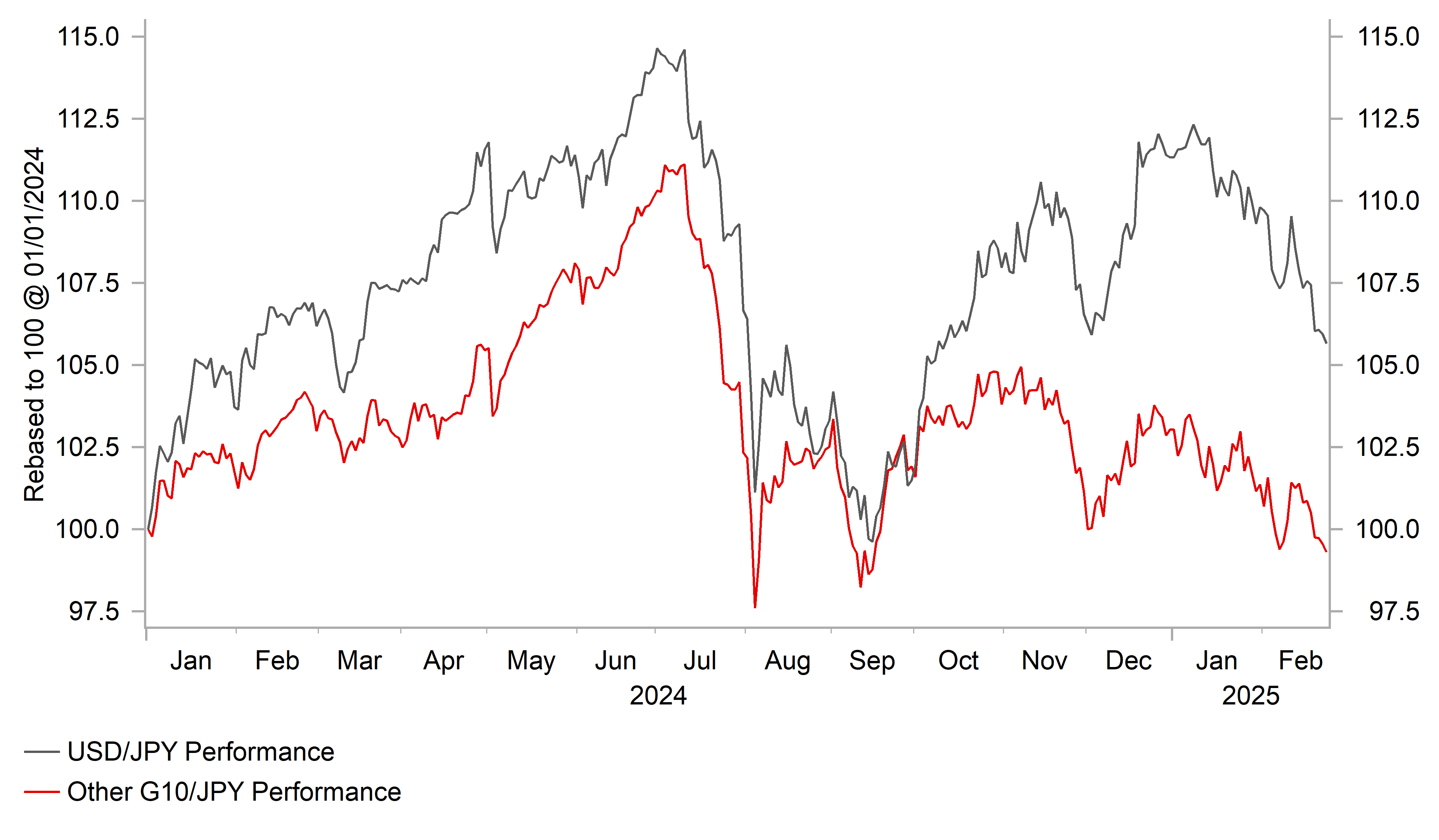 The yen has weakened modestly overnight rising back up to 149.50 after hitting a fresh year to date low yesterday at 148.57. Technical support was provided by the early December low of 148.65 that was tested but has held for now. The yen benefitted yesterday alongside the other traditional safe haven currency of the Swiss franc from building investor concerns over the weakening outlook for global growth. It has contributed to the recent underperformance of the commodity-related currencies of the Australian, Canadian and New Zealand dollar that have been the worst performing currencies this week. Similarly, Bloomberg’s commodity price index has corrected lower over the past week after recording strong gains at the start of this year. Investor concerns over slowing global growth were reinforced by the release yesterday of further evidence showing a drop in US consumer confidence. The Conference Board’s expectations measure of consumer confidence dropped sharply by almost 9.3 points in February and hit the lowest level since June of last year. The deterioration in consumer confidence was driven both by building concerns over higher inflation and worsening conditions in the labour market. The average measure of inflation expectations in twelve months rose by 0.8 point to 6.0% which was the highest reading since May 2023. At the same time, the differential between jobs plentiful and jobs hard to get measure fell by a further 2.3 points to 17.1 to the lowest level since February.
