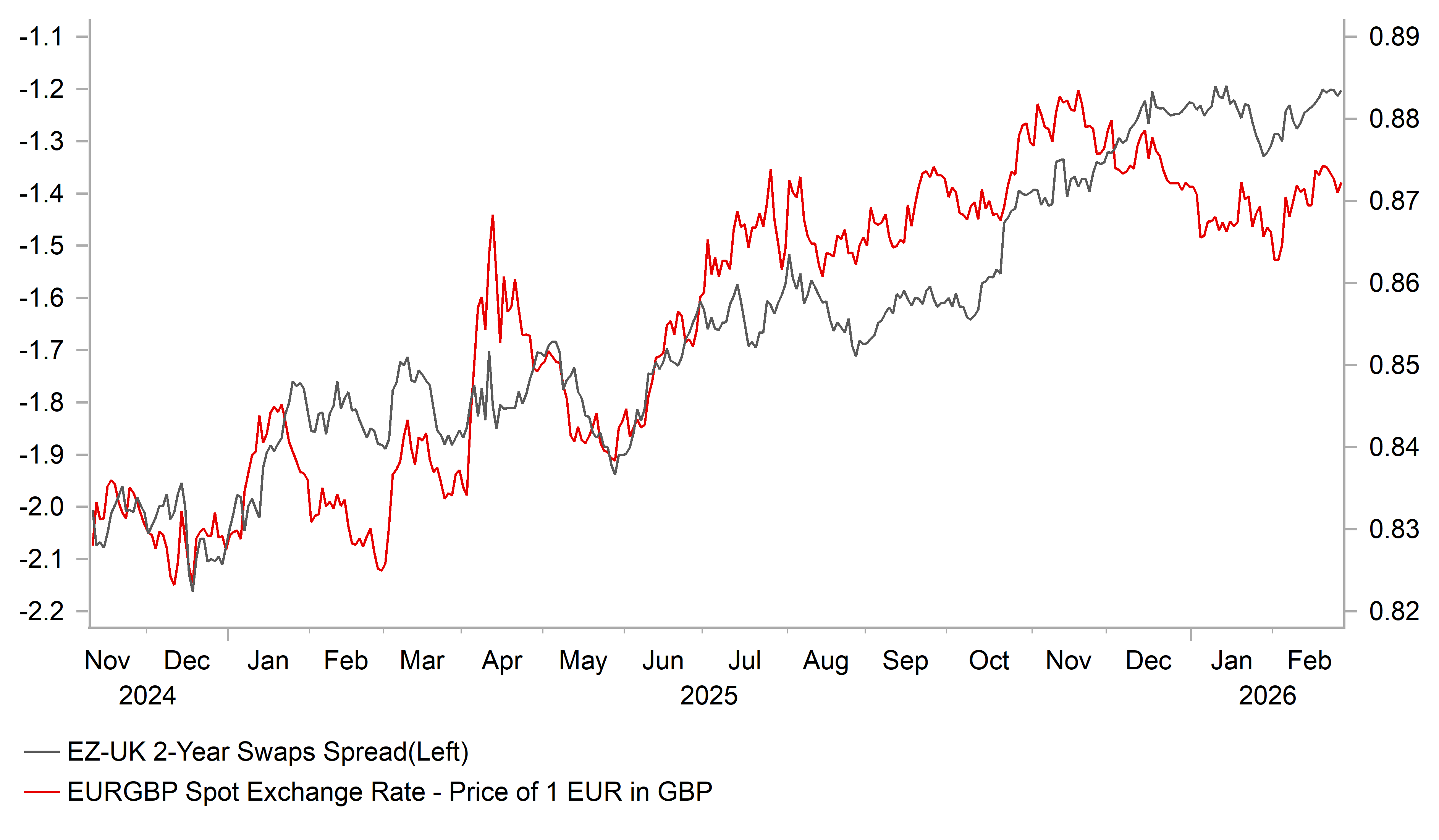 The pound has strengthened at the start of this week resulting in EUR/GBP falling back towards the 0.8700-level after hitting a high last week at 0.8752. The pound has derived some support from evidence of stronger UK growth momentum at the start of this year, and from comments by BoE Governor Bailey who did not strongly signal he was likely to vote for cut at the next policy meeting in March. The UK rate market has moved to slightly scale back expectations for a rate cut next month but is still pricing in around 18bps of cuts. When asked if he had seen enough further evidence to feel that I’m confident to take that step and vote for a cut, he stated that “it’s a genuinely open question at the moment”. He also expressed disappointment that services inflation did not fall as much as hoped in the latest CPI report for January.
