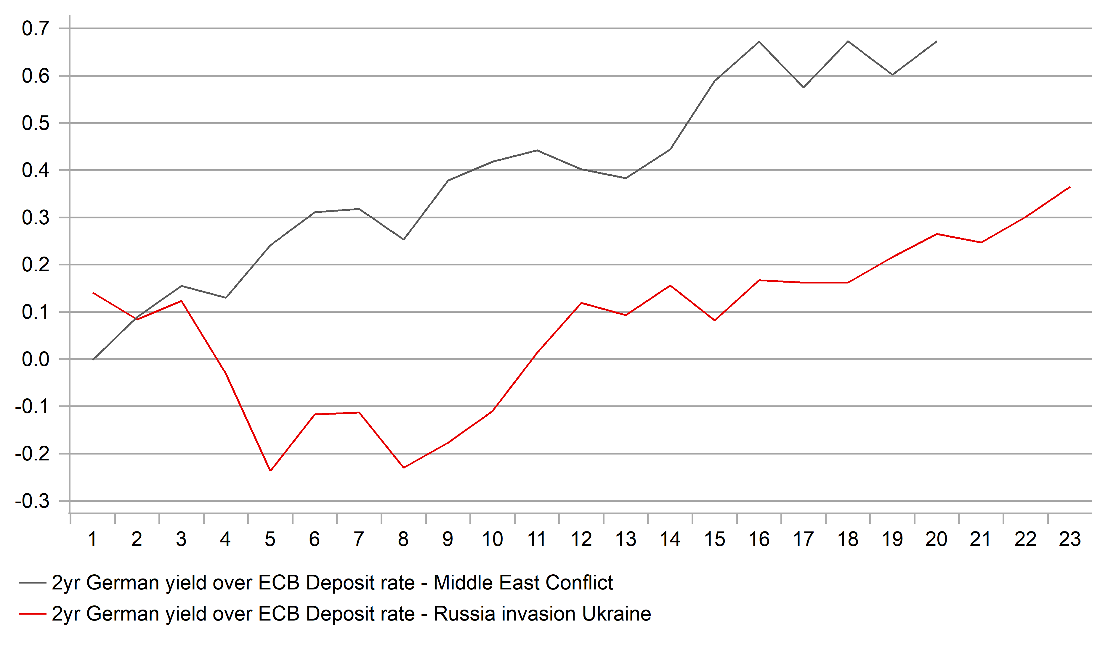 At this juncture, the comments are credible evidence of a likelihood of action, some time in Q2. Equity market performance and broader financial market conditions will be important but if equity markets remain relatively resilient then action is more likely than not. The chart above highlights the difference in yields on this occasion compared to 2022 after Russia’s invasion of Ukraine. The 2-year yield over the ECB policy rate is rising more sharply now than in 2022 despite the ECB policy rate back then being negative.
