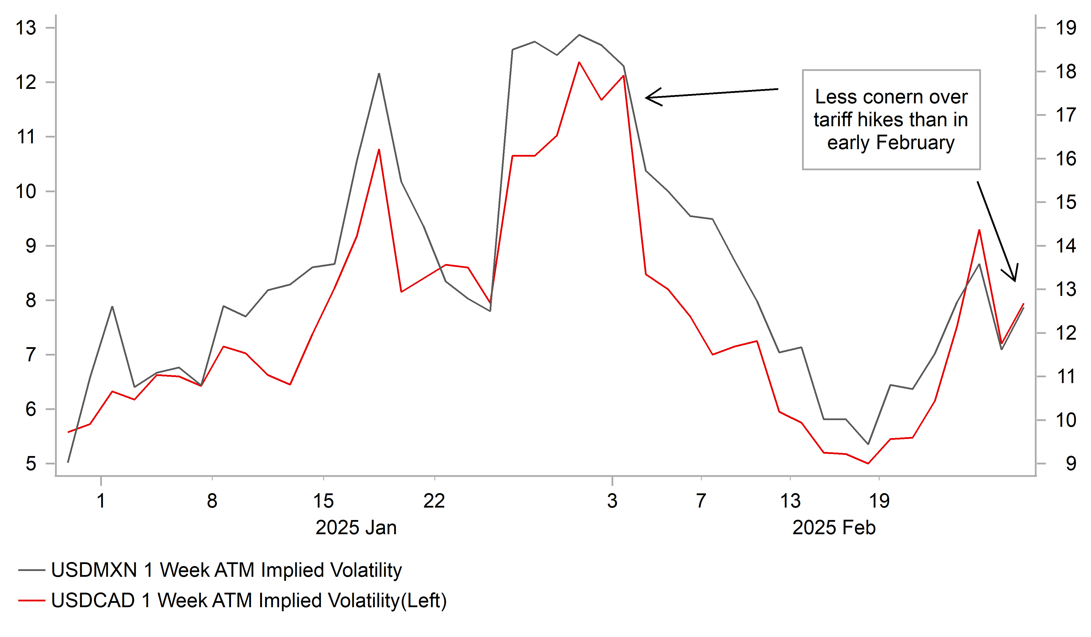 CAD & MXN IMPLIED VOLS REMAIN LOWER THAN IN EARLY FEBRUARY