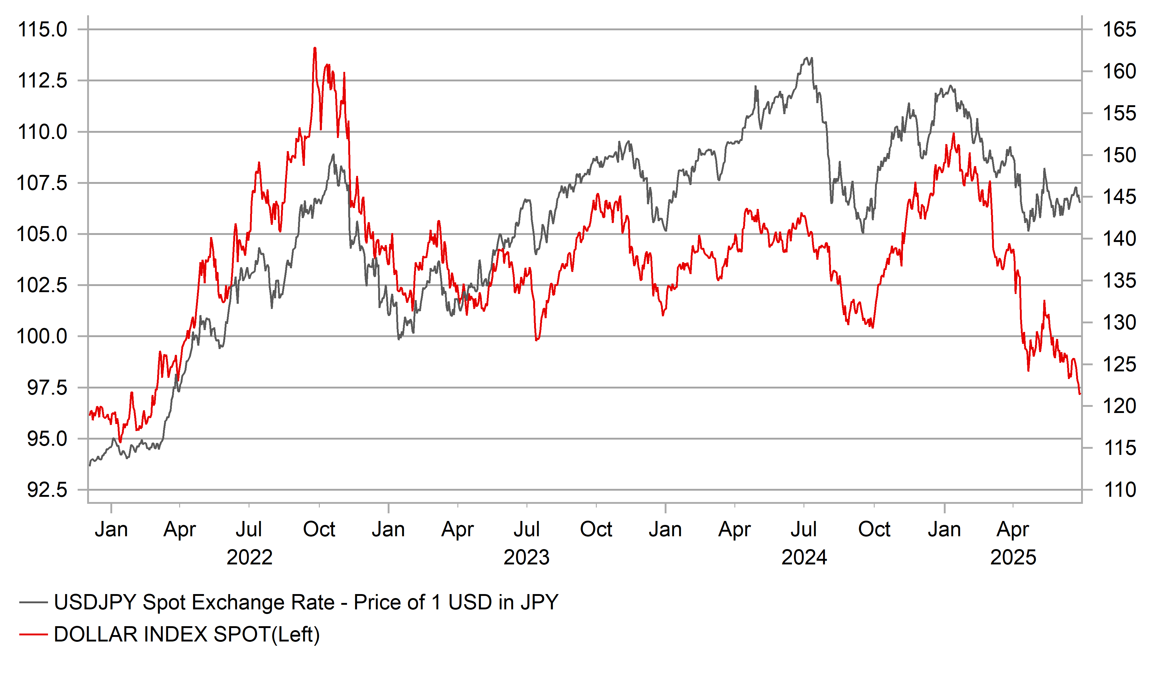 So what does this all mean for the dollar? Well based on the selling of the dollar earlier on reciprocal tariffs and the hit to confidence due to Section 899, these developments could be viewed as dollar positive. But the rebound for the dollar has been marginal. Market participants may want to see more of these deals formalised first and in any case nobody doubts the ideological views of the administration – to shrink the record trade deficit, and tariffs and dollar depreciation help. Part of the sell-off of the dollar is due to the unpredictability of policy from Washington and that is unlikely to change. In addition, the global outlook is a little better today and that will curtail the selling of non-dollar currencies. Expectations of a slowing US economy and Fed rate cuts will also curtail dollar buying. If Japan is included in these 10 deals it leaves the BoJ in a much better position to hike rates this year, which is not priced (just 3bps for September) and even following today’s weaker CPI data, the BoJ is likely to hike if international conditions permit. The DXY is back at March 2022 levels but USD/JPY remains considerably above March 2022 levels (116.00/117.00) underlining scope for some catch-up. Receding reciprocal tariff risks is a positive development, but policy uncertainties from Washington and expectations of a more active Fed in cutting rates will limit the scope of the dollar rebound.