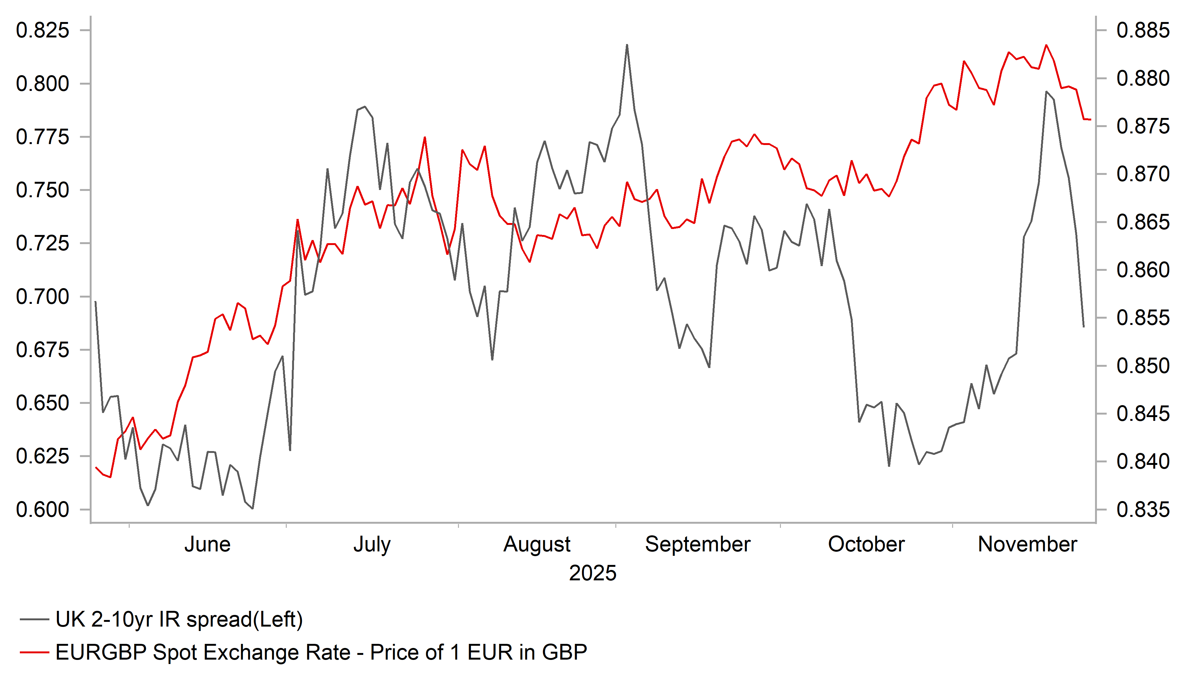 The yen has remained weak alongside the US dollar at the start of this week. The main development yesterday were media reports revealing Japan’s government plans to issue an additional JPY11.7 trillion of bonds to fund the supplementary budget totalling JPY18.3 trillion according to a document seen by Bloomberg. The rest of the supplementary budget will be plugged by tapping JPY2.9 trillion in tax revenue surpluses, roughly JPY1 trillion in non-tax revenue, and about JPY2.7 trillion in unused funds from the previous fiscal year to limit borrowing. The additional JPY11.7 trillion of bond issuance is consistent with the pledge from Prime Minister Takaichi that total bond issuance for this fiscal year will remain below last year’s total of JPY42.1 trillion coming in at JPY40.3 trillion. JGB yields have stabilized at higher levels since details of the supplementary budget were released after hitting year-to-date highs on 20th November. While the supplementary budget details have eased some of the fiscal concerns in Japan, the yen remains vulnerable to further weakness in the near-term.