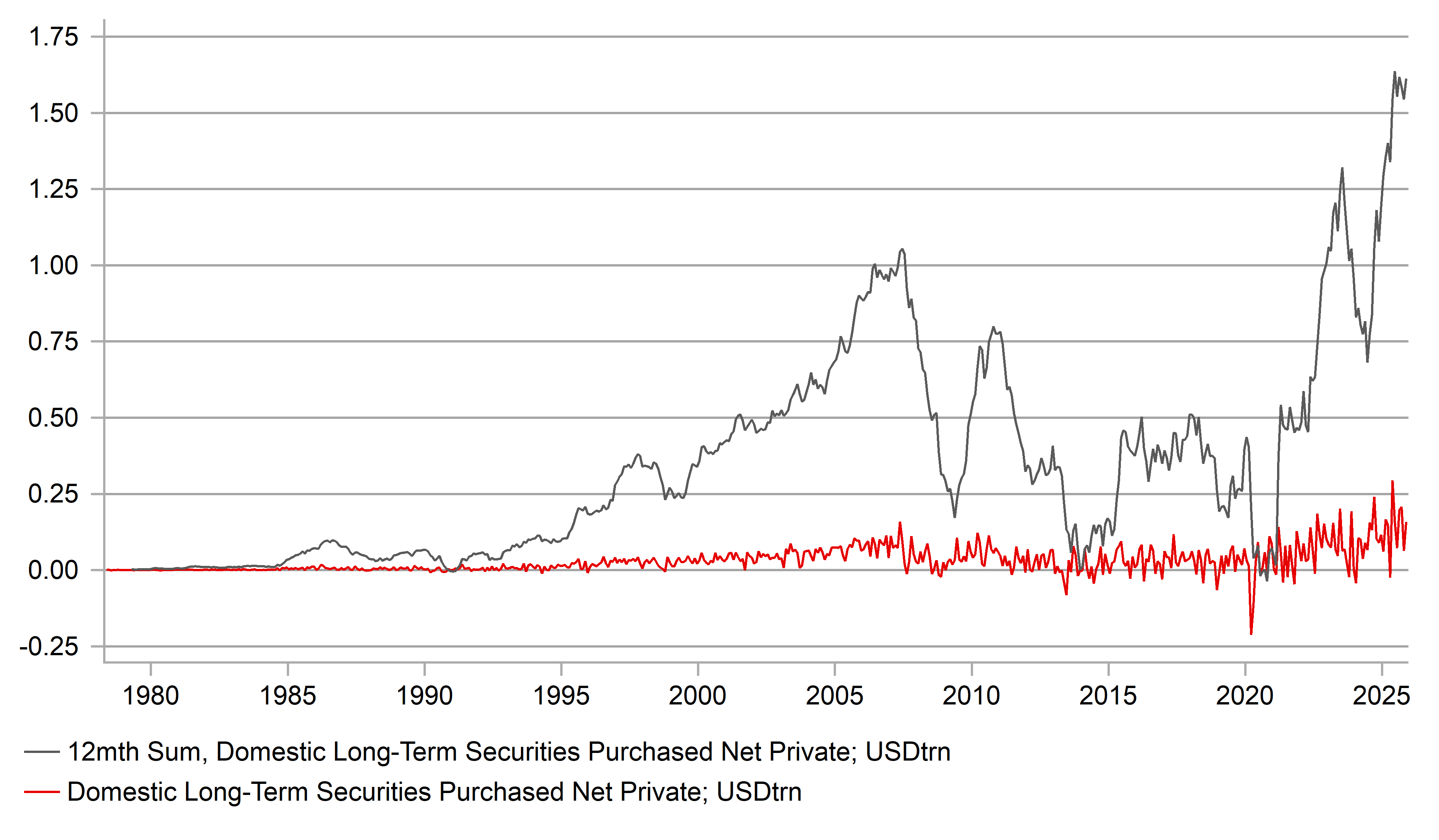 So, the US strong dollar policy remains intact! US Treasury Secretary Scott Bessent said so yesterday in a CNBC interview. The US “always has a strong dollar policy” Bessent stated but that’s because they aim to set sound economic policies and “if we have sound policies, the money will flow in”. But that logic is simply not right. A quick look at flows as reported from the US Treasury department shows the US drew USD 1,569bn of foreign capital into bonds and equities in the 12mths to November with US investor buying of foreign assets totalling around USD 300bn for a net inflow of over USD 1.2trn. It’s no coincidence that the total securities net inflow closely matches the overall trade deficit. We know that in 2025 the US dollar fell by close to 10% so there is not necessarily a link between the cross-border capital flows and the performance of the dollar.