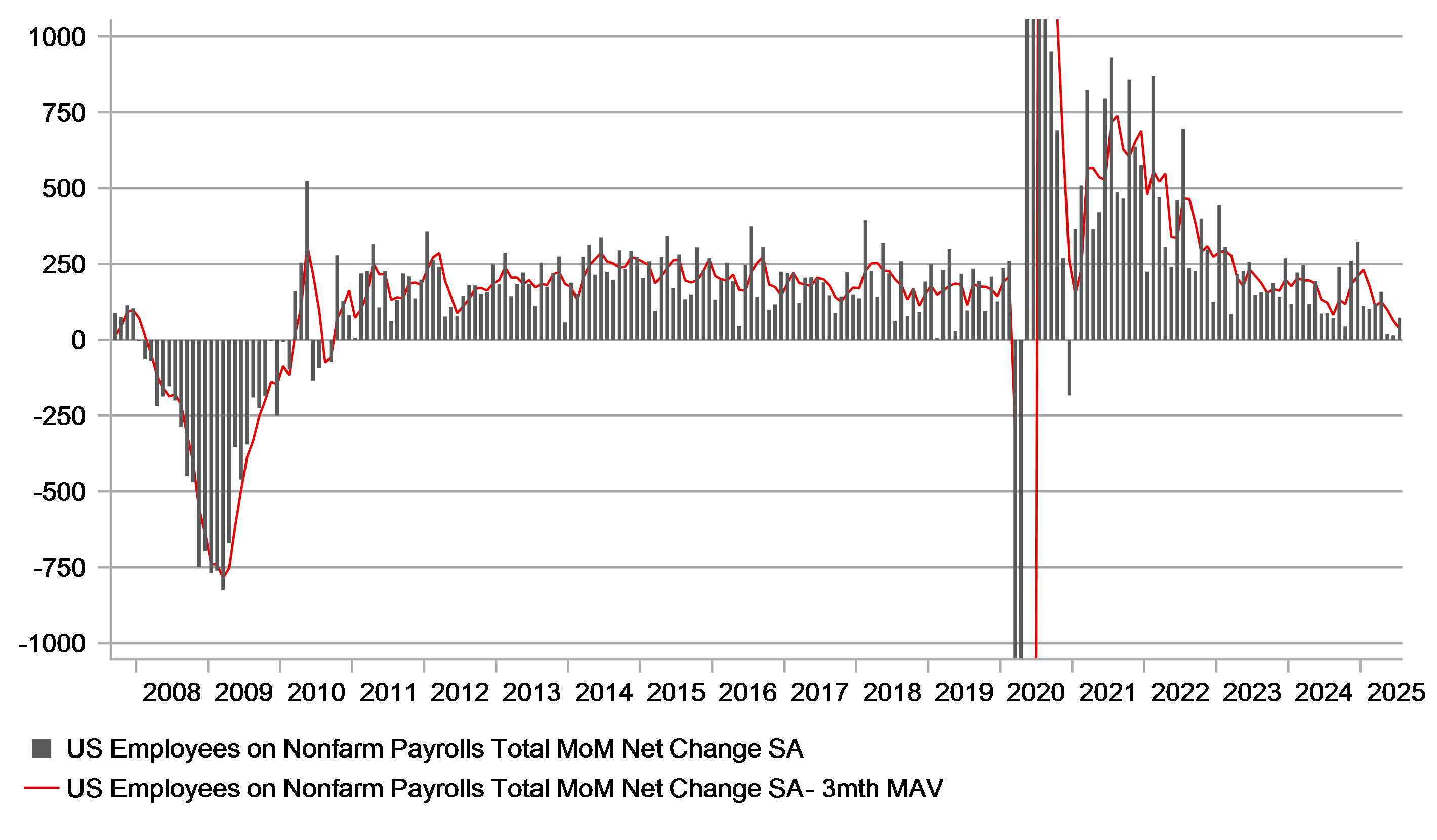 However, it is easy enough to make the case that the fundamental news that triggered this drop in yields is potentially more significant. The Fed has come in for criticism and none more than from President Trump, who called Fed Chair Powell a “stubborn moron” before the data and called on the board to “assume control” if he refuses to cut. The firing of the head of the BLS further intensifies concerns over government influence into areas that should be independent. The data revisions were near unprecedented and only happen during periods of economic shock. The 258k downward revision happened last during covid and then before then during the GFC. The underlying picture has turned dramatically due to the revisions with the 3mth average at just 35k. The 3mth average to April was 127k. The non-cyclical private sector (excl education & health) recorded job losses of 49k over the three months to July. While there have been episodes of declines more recently, historically this is a development only for economic crises.