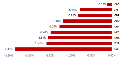 The primary contagion channel into the broader financial markets remains energy prices – in this scenario both crude oil price and natural gas prices. The FX impact itself is pretty clear – the above table indicates the returns over the first five days of at least a 3 standard deviation move from the average over a 200-day period. The move on Monday and again yesterday were the 22nd and 23rd episodes of 3 standard deviation moves higher in data going back to 2007. As expected, there is a broad gain for the dollar versus most of G10 with the returns for the dollar against the Canadian dollar and yen less compelling. The Swiss franc in fact outperforms the dollar.