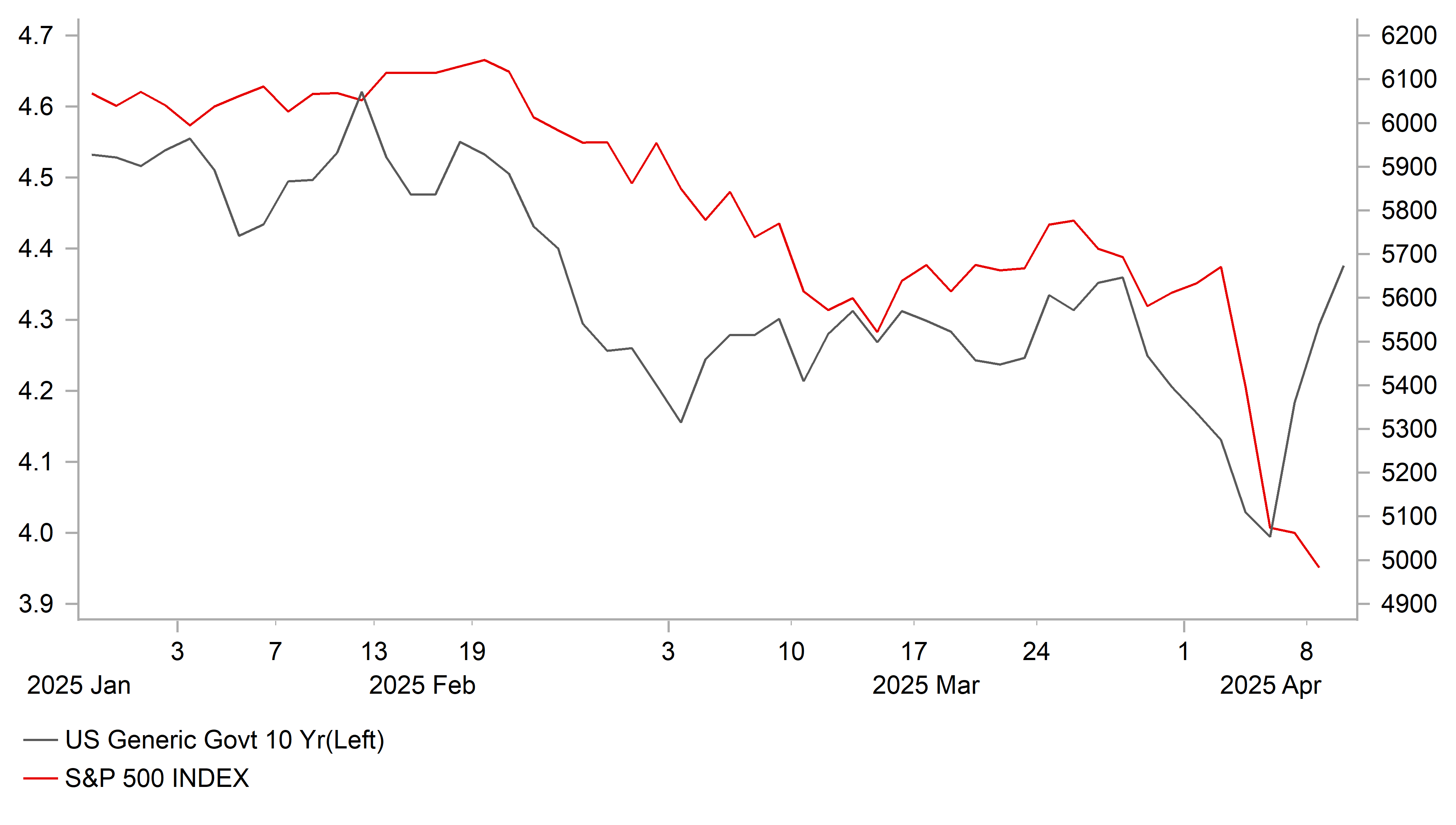 The sell-off in global equity markets has resumed overnight with the Nikkei 225 index falling by around 4.0%. It follows on from losses in US equity markets which also coincided with a sharp sell-off in the US Treasury market. Yields on the 10-year and 30-year US Treasury bonds have both surged higher by around 60bps over the last three trading days with the 30-year yield hitting a fresh year to date high of just over 5.00%. The unfavourable price action has cast some doubt on the safe haven status of the US government bond market and the US dollar at the time when the global trade war is intensifying. The US dollar has also fallen sharply overnight against the other major currencies of the euro, Swiss franc and yen resulting in the dollar index falling back below the 102.00-level. The sell-off in US equities, US bonds and the US dollar all at the same time follows President Trump’s decision yesterday to impose the higher “reciprocal tariffs” alongside the additional 50% tariff hike on imports from China. It lifts the US average tariff rate on imports from China up to around 114%. The implementation of the tariffs has reinforced concerns over the risk of a more stagflationary outcome for the US economy.