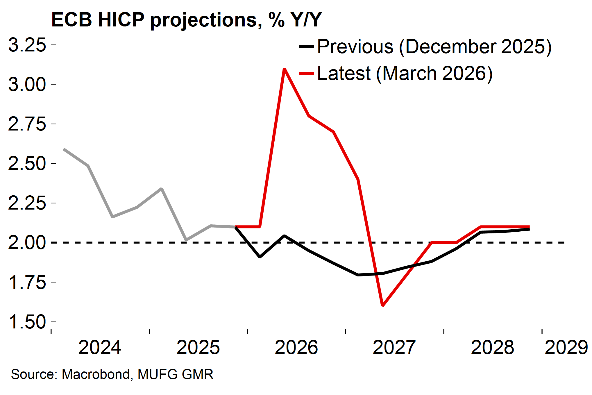 The updated projections (here) are more relevant than expected. The cut-off date for the market assumptions was brought forward to 11 March and hence captures the energy shock to a significant extent. The baseline assumes an average oil price of 81.3 USD/bbl this year. In that case, inflation is expected to average 2.6% in 2026, a 0.7pp increase on the December projections. The headline rate is then projected to fall to 2.0% next year (dare we say “transitory”?).