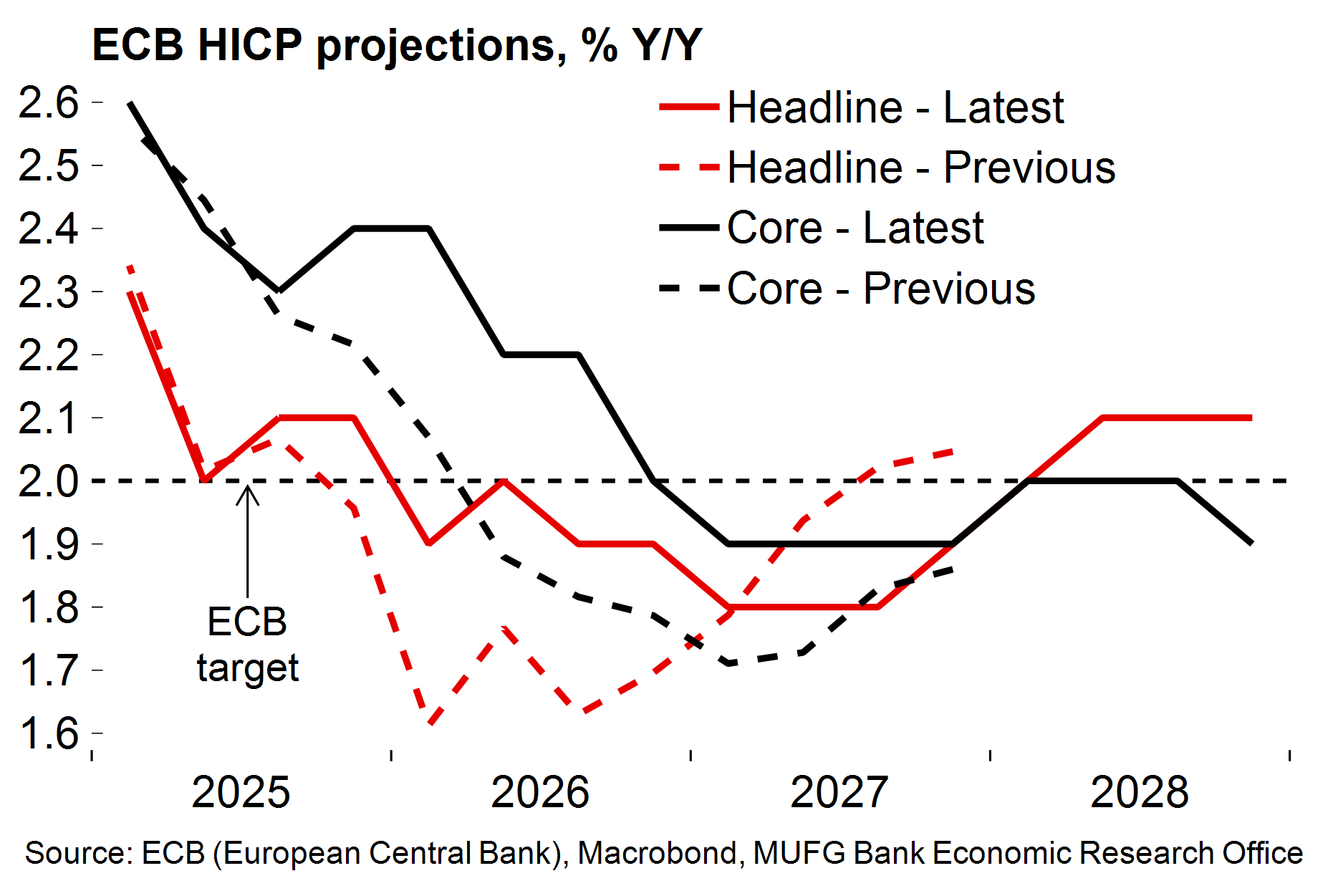 The ECB also revised up its growth outlook, as had been flagged by Lagarde earlier this month. It now sees growth at 1.2% in 2026, in line with our views, and 1.4% in 2027-28. Lagarde sounded more confident about the outlook in the press conference and mentioned a boost to activity from stronger private investment (especially related to AI) and the lack of any clear tariff frontloading reversal effects.