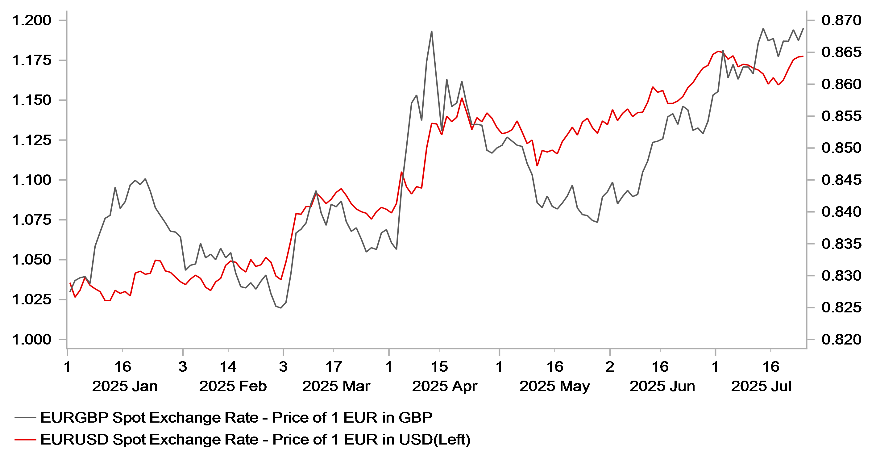 If the broad contours of any deal are in line with the reports then it wouldn’t be a million miles away from the ECB’s assumption for 10% US tariffs used in its latest projections from June (here) which saw inflation averaging 1.6% next year. Since then, energy prices have moved higher (Brent is up ~5.5%) but the reduced drag on headline inflation from this is likely to be offset, with a lag, by further strength in the euro (up ~4.5% on a trade-weighted basis).