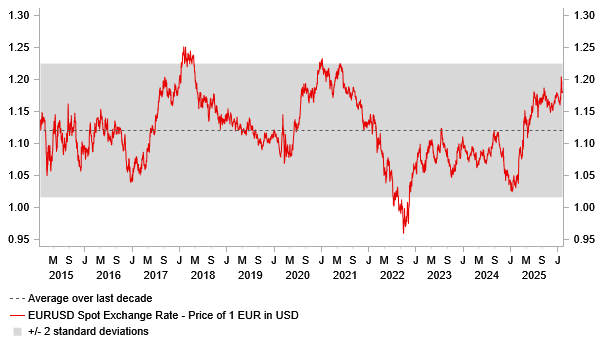 However, if the euro continues to appreciate as we expect this year lifting EUR/USD toward 1.2500, it would increase pressure on the ECB to lower rates further especially with inflation already projected to undershoot target. This is one reason why we judge that risks to our forecast (click here) for the ECB to leave rates on hold this year remain skewed to the downside.