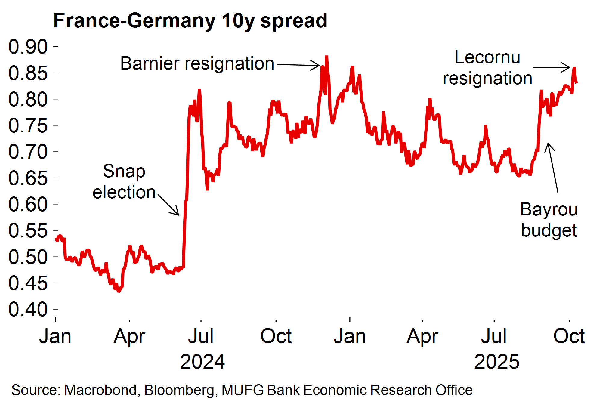 Parties’ focus on the bigger prize – the next presidential election – has been a significant factor behind France’s recent budget impasses. Every political decision has been framed through that lens. Opposition parties have attempted to walk a thin line between standing by their policy platforms and avoiding being seen as contributing to the current inertia and policy drift. Lecornu’s view is that the future government team should be “completely disconnected” from 2027 presidential ambitions, which seems to point to some sort of technocratic government. After the repeated failures previously, a change in approach seems overdue. It’s certainly plausible that a more technocratic figure, open to compromise and a slower pace of fiscal consolidation, could support some (relative) stability in France.