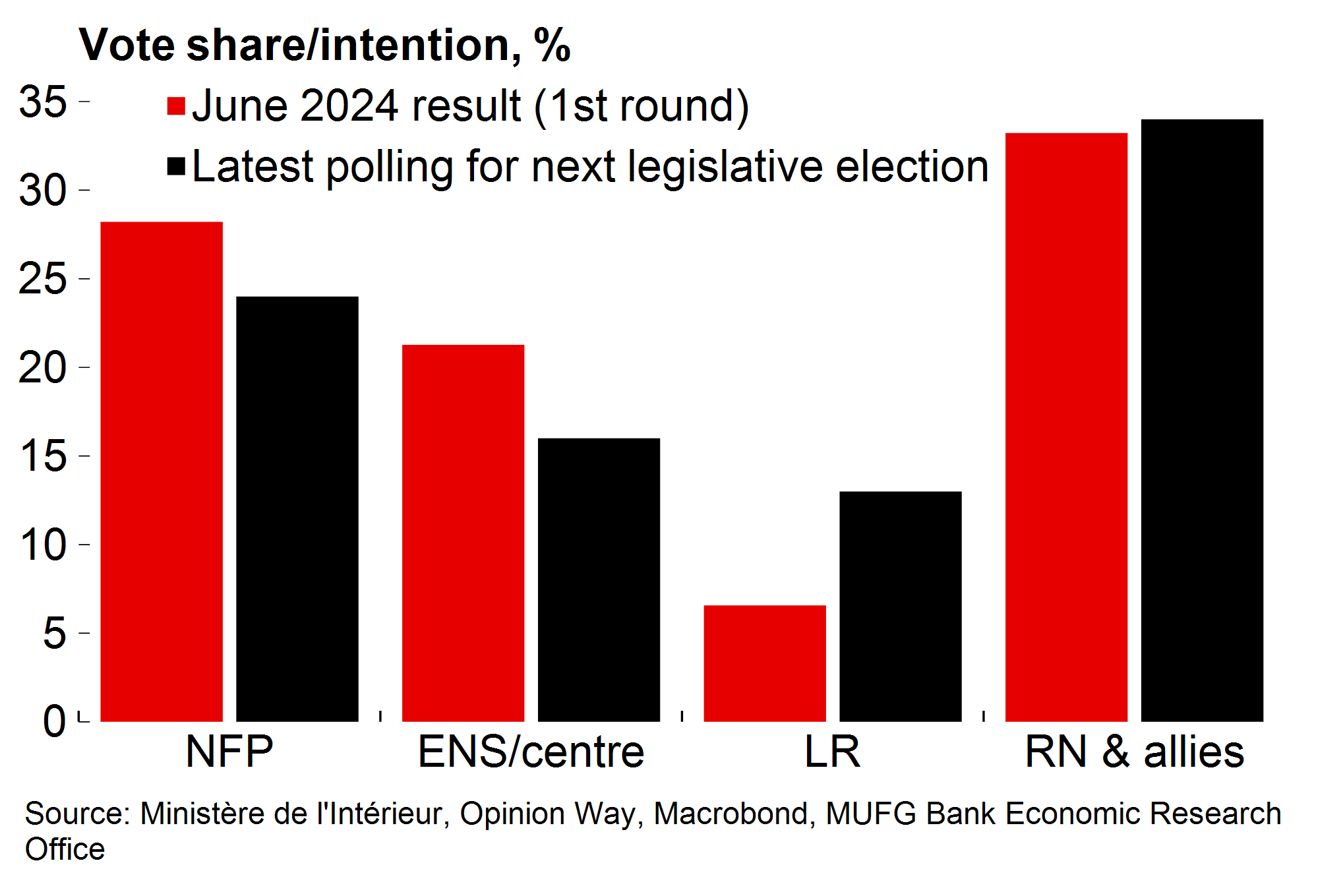 It is far from clear that another election would solve anything. Polling hasn’t changed much relative to the 2024 election result. The centre right and to a lesser extent RN have gained support, and the centrist alliance and the left have slipped back slightly. Legislative elections in France are hard to predict given the possibility of cross-party agreements and shifts between the first and second rounds of voting. It’s also interesting to see some polling (e.g. here) which suggests that the French public may be somewhat less inclined to vote tactically to block RN. But still the overall picture from the polls is that no group would be close to a majority and so we assume that a snap election would result in another fragmented National Assembly.