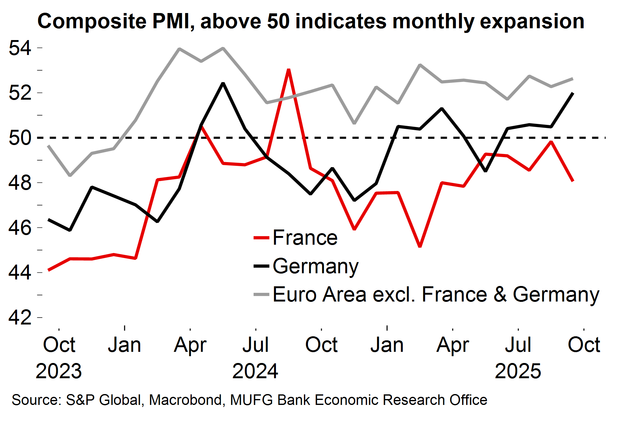Business sentiment was already looking weak even before Lecornu’s resignation. The composite PMI slipped to a five-month low of 48.1 in September. There are no obvious growth drivers for France. The need for fiscal consolidation remains, even if there is slippage next year, and both firms and consumers are likely to stay cautious. We had already factored in heightened political uncertainty into our latest forecasts and have below-consensus growth of just 0.7% in 2026, after a similar rate this year.