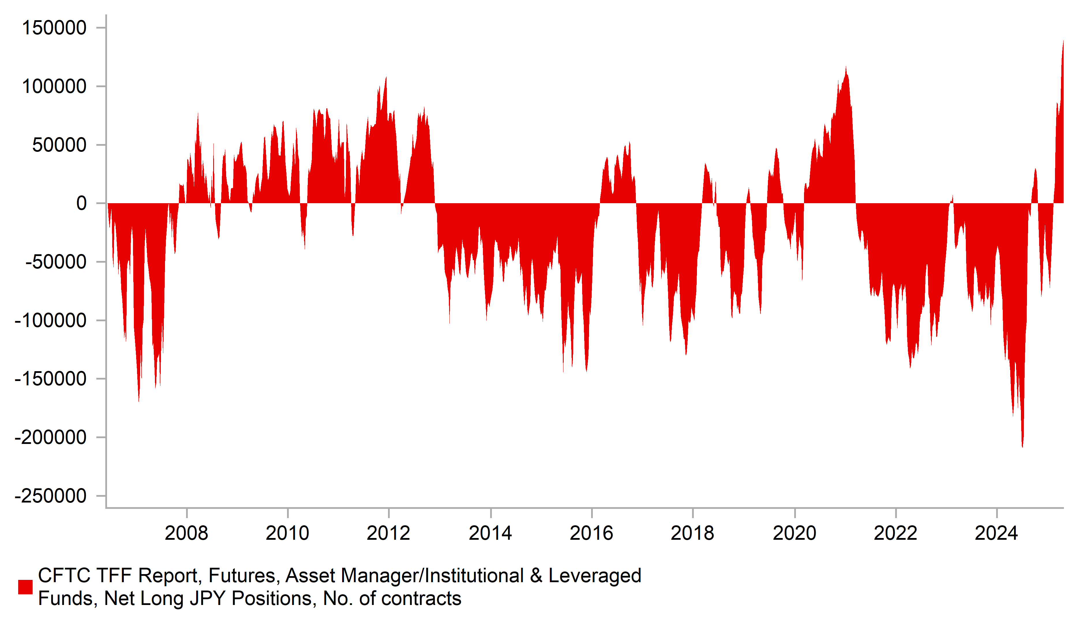 The sharp sell-off for the JPY in response to dovish BoJ policy update reflects in part that positioning. The latest IMM positioning data has revealed recently that long JPY positions built up by Leveraged Funds and Asset Managers had reached their highest level on record encouraged by expectations for further BoJ policy normalization. It is likely that long JPY positions have been lightened after the BoJ indicated that they will take more time to raise rates further depending on how trade risks develop going forward. However, we are not convinced that the dovish shift in BoJ policy will trigger a sustainable reversal lower for the JPY even after USD/JPY has once again failed to break back below the 140.00-level similar to in September of last year and December 2023 providing important technical support.