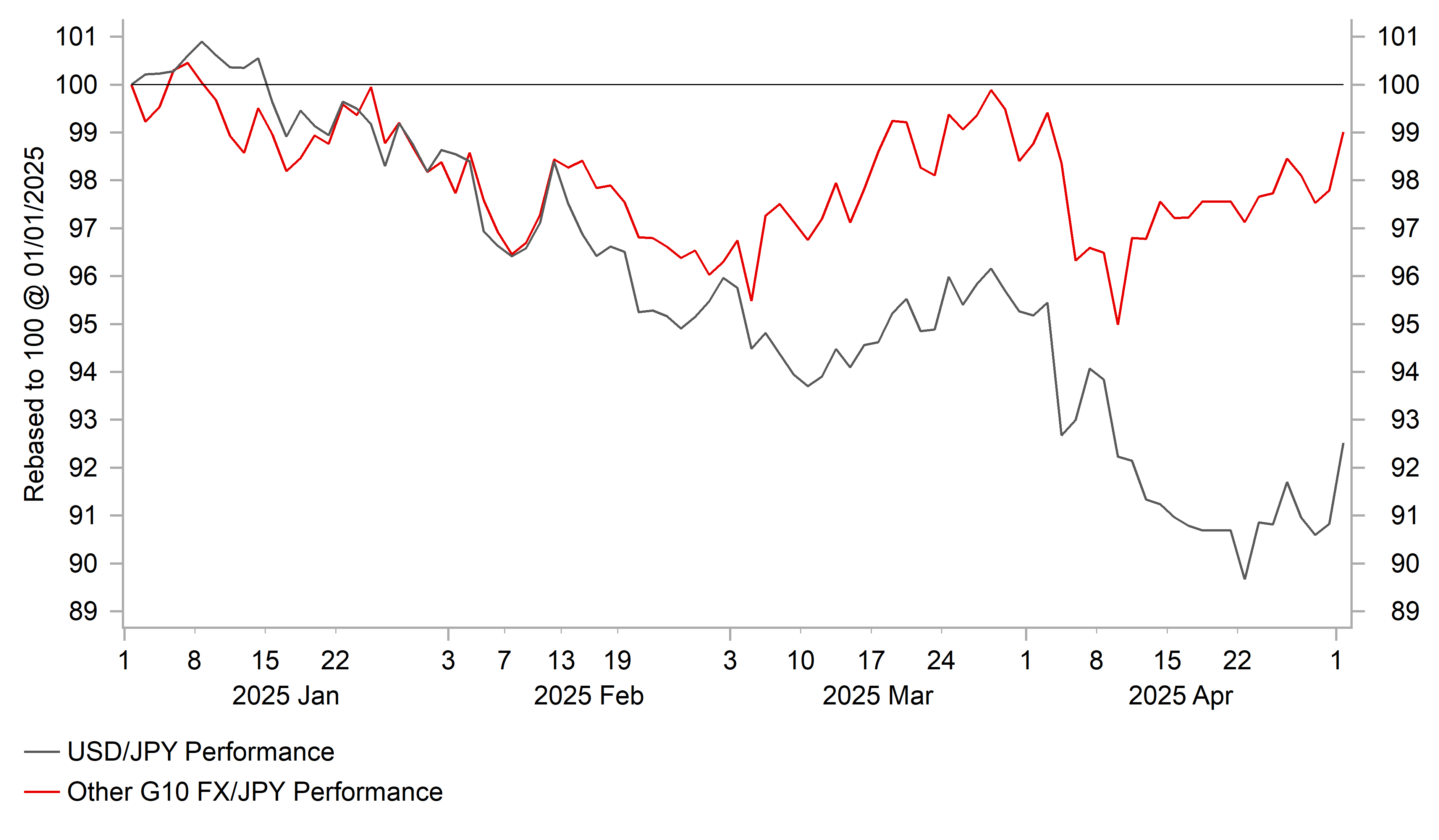 The GBP has continued to recover lost ground over the past week following the sell-off in the first half of last month triggered by President Trump’s “Liberation Day” tariffs announcement. At the worst point, EUR/GBP hit a high of 0.8738 on 11th April but has briefly dropped back below the 0.8500-level this week. The GBP has underperformed over the past month alongside the other high beta G10 currencies of the NOK and AUD. The broad-based loss of confidence in the USD has still resulted in cable rising back to the highs from last September at just over the 1.3400-level which currently represents an important resistance level standing in the way of further upside.