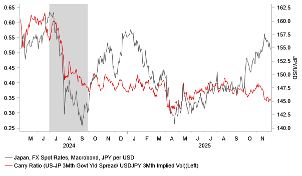 If the JPY continues to weaken after the Fed cuts rates and the BoJ hikes this month, pressure will mount on Japan to intervene in the FX market for the first time since July 2024, when USD/JPY was trading between 157.00 and 162.00. On that occasion, Japan intervened on 11 and 12 July to support the yen, ahead of the BoJ’s rate hike on 31 July. The combination of intervention and a BoJ hike triggered a sharp unwind of JPY-funded carry trades during the summer of 2024. The rebound was later reinforced by the Fed starting its easing cycle with a larger 50bps cut in September. This episode serves as a reminder of the risk that the JPY could strengthen sharply again if carry trades are unwound. Our short-term valuation models currently indicate that JPY weakness has significantly undershot normal fundamental drivers, increasing the risk of a bigger snapback if concerns over the policy shift underway in Japan under Prime Minister Sanae Takaichi begin to ease.