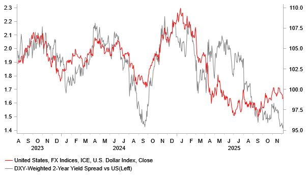 In contrast, the JPY has rebounded since USD/JPY hit a high of 157.89 on 20 November, falling to a low of 154.35 earlier today. The stronger JPY has been driven by a hawkish repricing of BoJ rate hike expectations. A keynote speech from Governor Ueda on Monday signalled that the BoJ is planning to resume rate hikes as soon as this month. Media reports from Bloomberg and Reuters have since confirmed that a hike is likely unless a negative economic or market shock occurs before the next policy meeting on 19 December. The last major economic data release before that meeting will be the Q4 Tankan survey, scheduled for 14 December. Reports suggest the government will not block the BoJ from raising rates, easing concerns of pushback under new Prime Minister Takaichi, who favors reflationary policies to boost growth. These developments support our forecast for the BoJ to raise rates by 25bps this month and deliver further gradual tightening next year, with two additional 25bps hikes expected to lift the policy rate to 1.25%. This would bring the rate closer to the BoJ’s estimated neutral range of 1.00%–2.50%, although Governor Ueda emphasized this week that the precise location of the neutral rate remains highly uncertain.