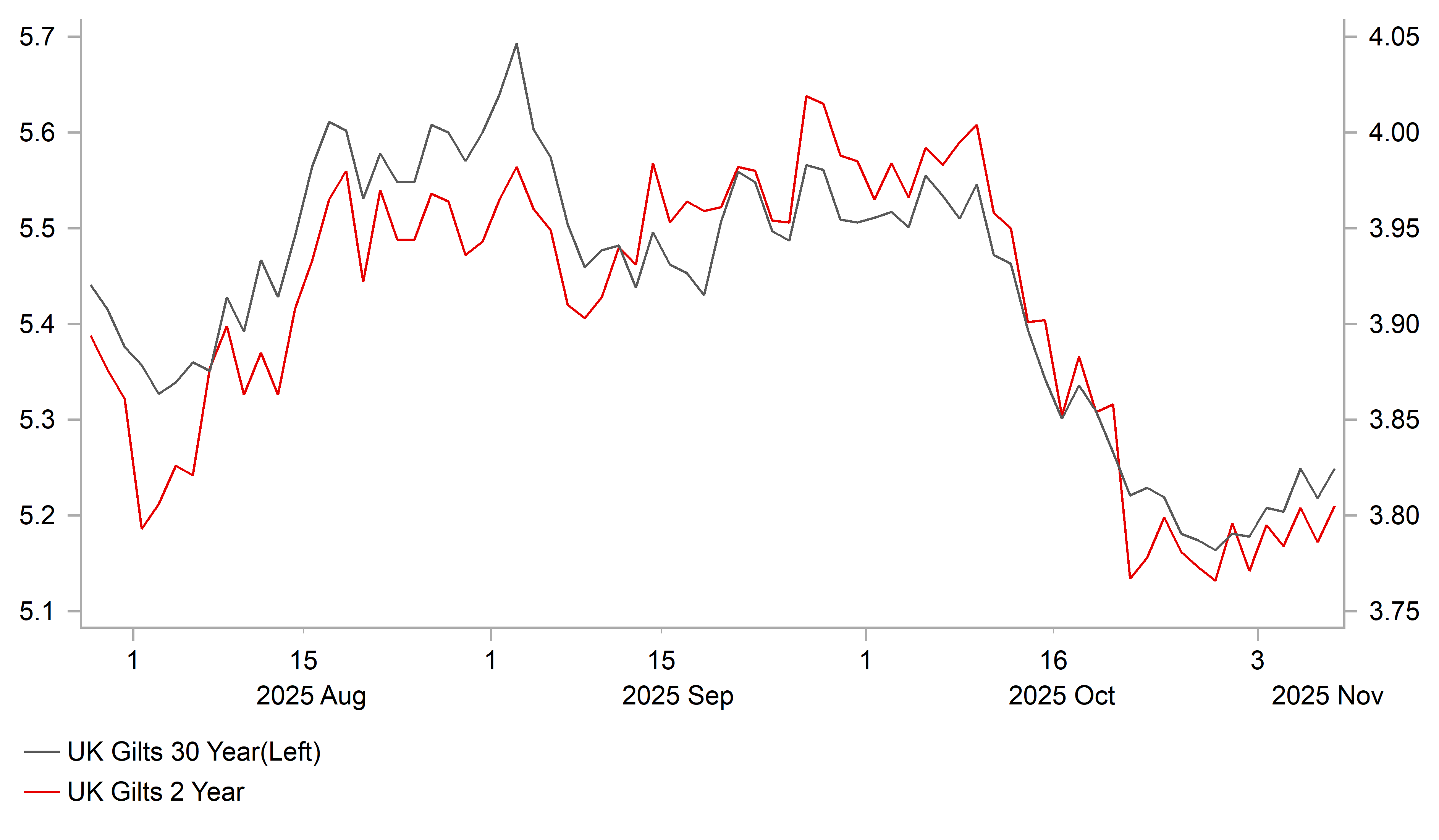So we still see scope for this easing of dollar buying momentum turning back to dollar selling. If EUR/USD was to trade to the mid-1.16 level by end-Nov, the seasonal bias that strongly favours higher EUR/USD in December makes our 1.20-level still achievable. The OIS market shows 17bps of cuts for the December FOMC and a fed funds of 3.08% by October 2026. We see scope of that level being achieved more quickly and weak payrolls data and renewed economic uncertainty fuelled by another bout of trade uncertainty would likely see a renewed drop in US yields. The failure of dollar gains to extend after the DXY technical break this week is a bearish signal.