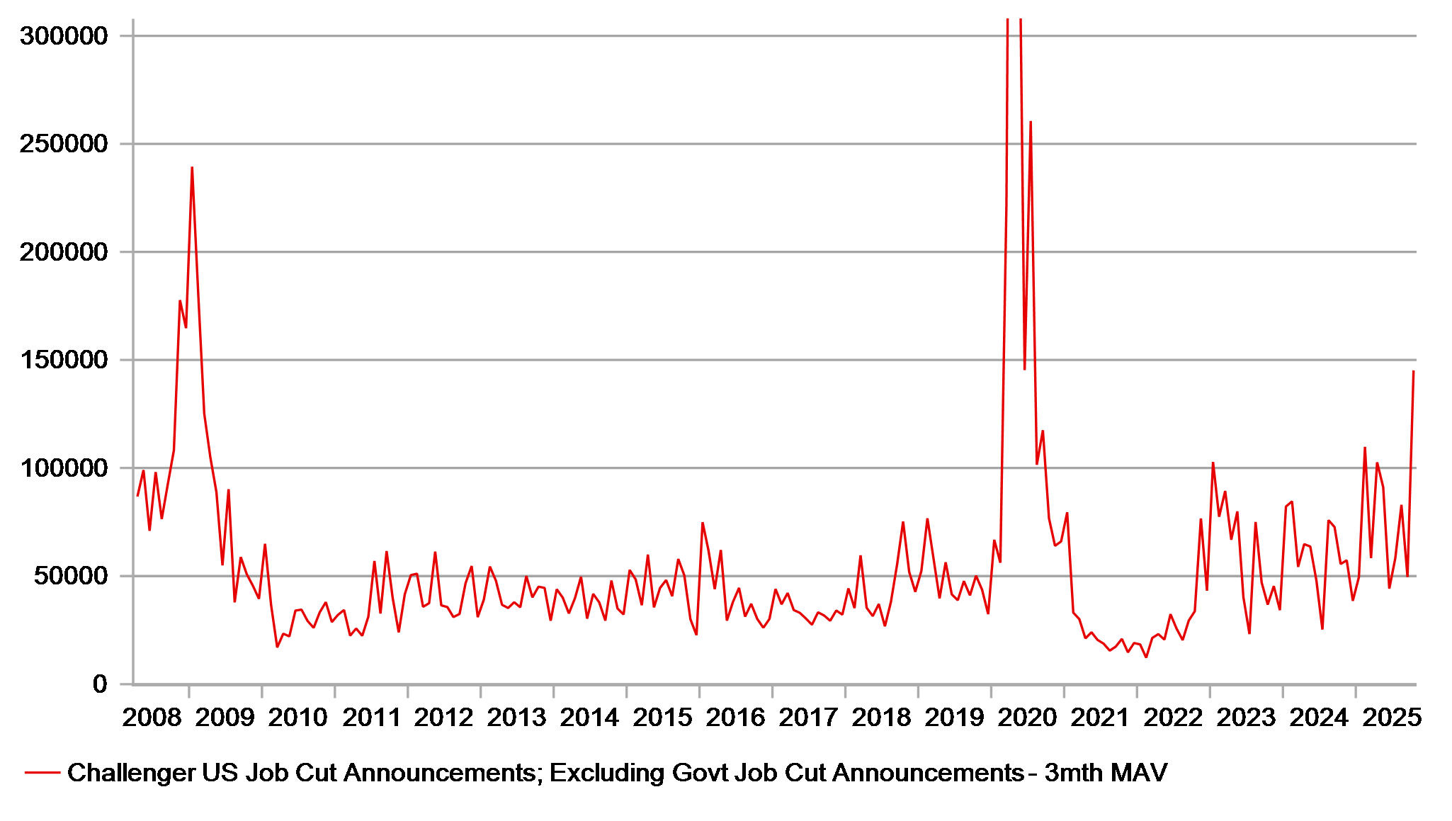 The 2-year UST bond fell 8bps yesterday, primarily on the back of the Challenger Job Cut Announcements data that revealed job announcement cuts of 153k in October – that was the largest October increase since 2003. On a year-to-date basis, Challenger data shows close to 1.1mn job cuts have been announced in 2025, which when 2020 is excluded is the largest over the Jan-Oct period of any year since 2009 during the Global Financial Crisis. Furthermore, when the data is viewed excluding the impact of DOGE and government sector job losses, it paints an even worse picture. Excluding government job cut announcements, the total surged to 145k in October, by far the worst total of any month since 2009 during the GFC when 2020 is excluded. What else can we garner from private sector data? The ISM employment reading remain below the key 50-level for manufacturing and services but the contraction has been diminishing. Indeed job advertisements data also indicates a weakening trend. Looking at the data on a weekly basis, the 4-week average hit a new low in October, hitting levels not seen since 2020. Revelio Labs – another private sector employment data source (using HR and payroll data) – revealed a 9.1k drop in employment in October, down from a 33k gain in September. It was the second drop in 2025 (other was May) although this data set only began in Feb 2021 so there is not much historical context. ADP did reveal a rebound in October (42k vs -29k in Sept) so while the data is somewhat mixed, the private sector data overall does clearly still point to continued weakness in employment and a pick-up in firing. Once the NFP data is released after this government shutdown ends, we see it as more likely the official data will continue to reveal a weakening trend in jobs growth.