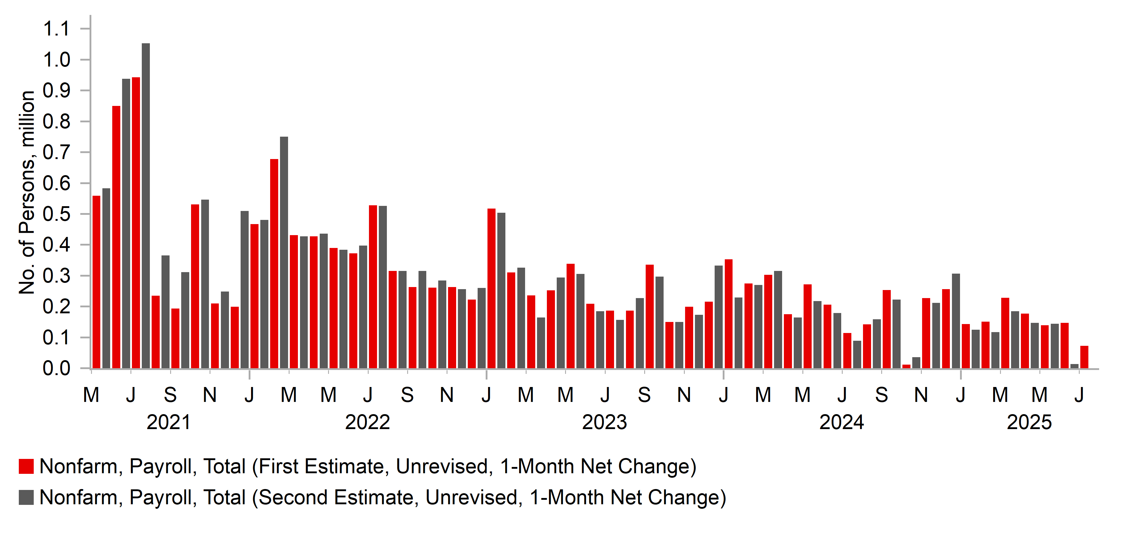 Last week’s NFP report presented a rare and statistically significant culmination of events. Not only did the July NFP print surprise to the downside (73k vs 105k expectation), coming in below the median Bloomberg survey forecast, but both the June and May figure was significantly revised lower, a combined impact of -258k jobs. This has only occurred 20 out of 304 monthly releases since January 2000. In this report, we examine the FX implications of this rare NFP dynamic, focusing on short-term FX price action in the subsequent periods. Our analysis leverages historical FX returns and statistical testing to assess the strength of the signal, assessing whether it can influence FX positioning in the current macro environment