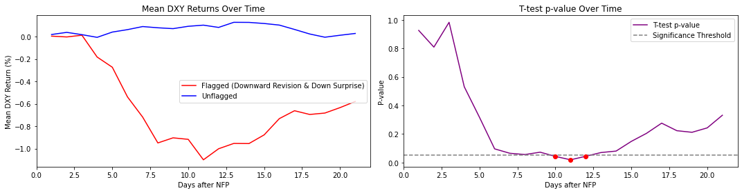 Based on historical data, DXY continues to weaken daily following NFP events with both a downward revision and downside surprise. The weakening is statistically significant across multiple days, especially between 6-12 trading days. The directional bias remains consistent across the entire 21-trading day period. Even when statistical significance fades, the economic signal remains directionally aligned.