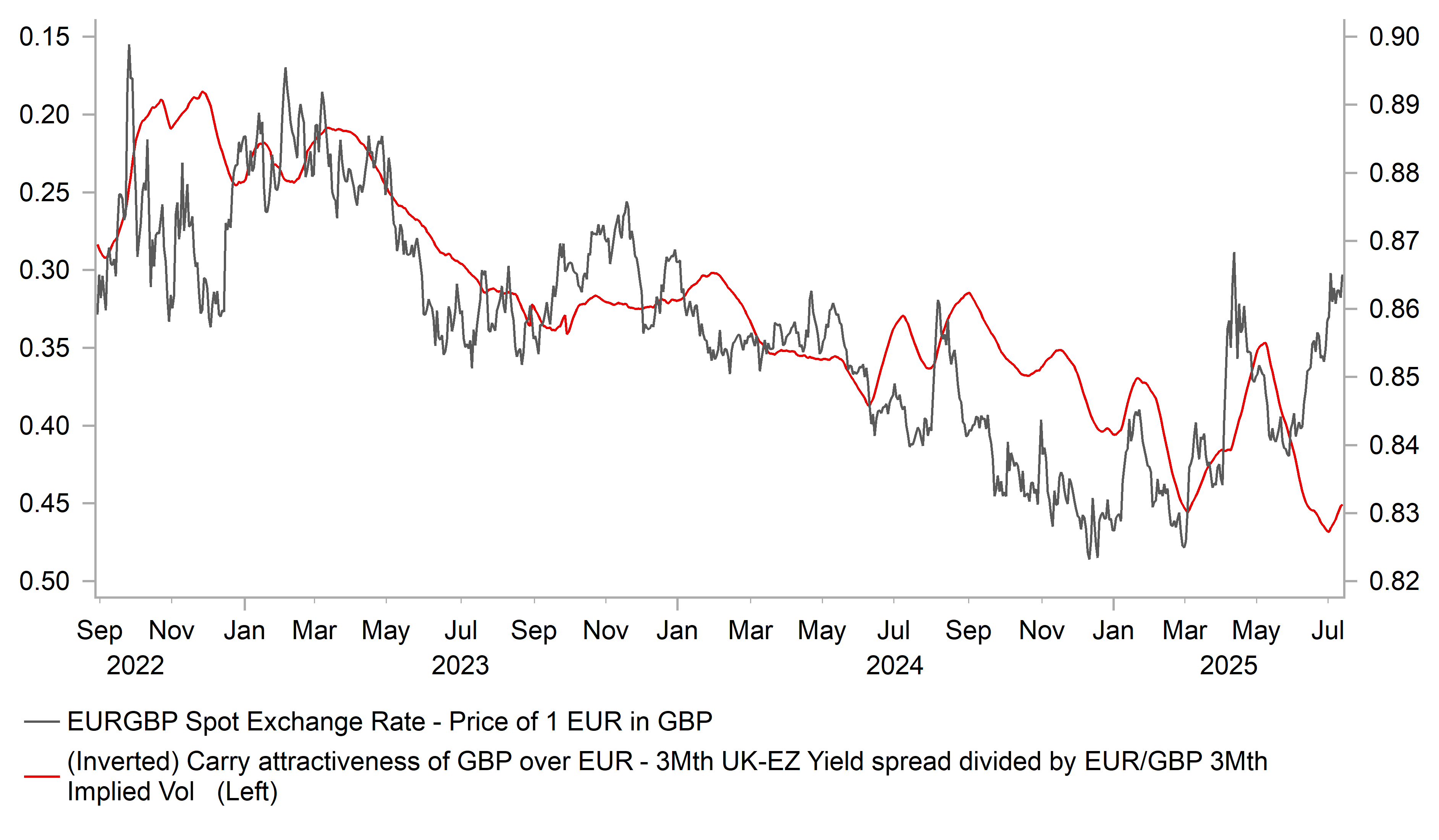 On the one hand the GBP has been benefitting from the higher yields on offer in the UK which has helped to boost its carry appeal. The gradual pace of BoE rate cut has helped to keep yields in the UK amongst the highest on offer for G10 FX. However, there have periods like last week when rising yields at the long end of the curve driven by UK fiscal concerns have flipped to become negative factor for the GBP. The correlation between GBP performance and long-term gilt yields has become more negatively corelated in recent years since the mini-Budget shock in autumn 2022 that brought an end to former Prime Minister Liz Truss and her Chancellor Kwasi Kwarteng. While we are not expecting a repeat for the current UK government this autumn, they will be under pressure announce credible fiscal tightening measures to prevent another sell-off in the gilt market and for the GBP.