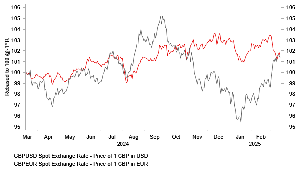 Market participants now expect monetary policies between the ECB and BoE to diverge less going forward which has helped to narrow yield spreads in favour of a stronger EUR. At the ECB’s last policy meeting (click here) they left the door open for further modest rate cuts with the policy rate now closer to the neutral estimate put forward by President Lagarde between 1.75% and 2.25%. Based on our assumption that legislation is passed next week on Tuesday to boost fiscal policy in Germany, it will ease pressure on the ECB to lower rates below neutral. The main risk to that view would be a much bigger hit to growth in Europe from President Trump’s upcoming plans for trade tariffs in early April. The EU’s decision to quickly retaliate by imposing tariff hikes from next month on EUR26 billion of US imports in response to US tariff hikes on steel and aluminium imports has angered President Trump, and he has since threatened to impose 200% tariffs on over USD10 billion of alcohol imports from the EU. In contrast, the Trump administration has praised the UK government for their decision not to retaliate. It will further encourage market expectations that the UK economy will not be hit as hard by further tariff hikes in the coming months.