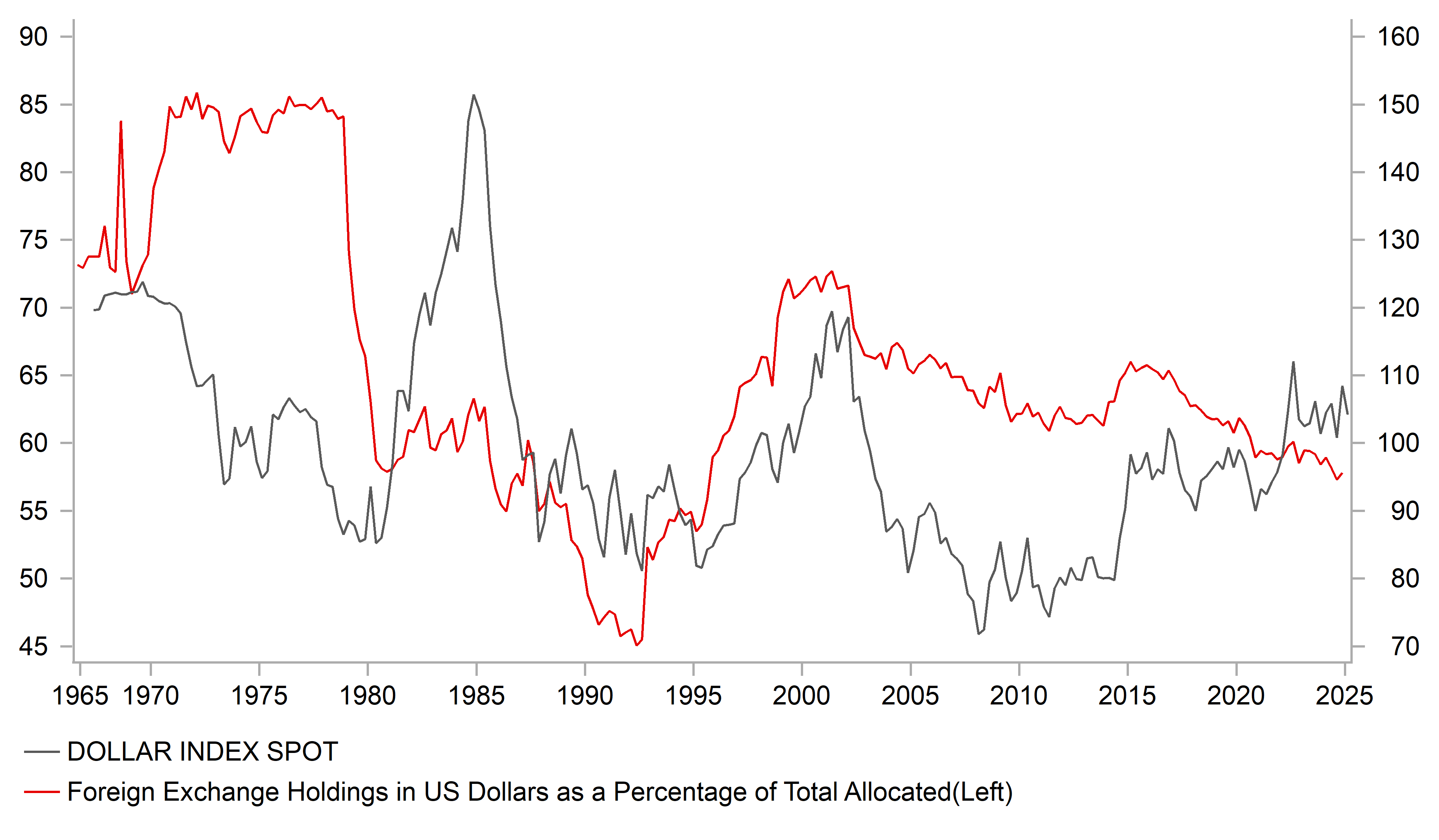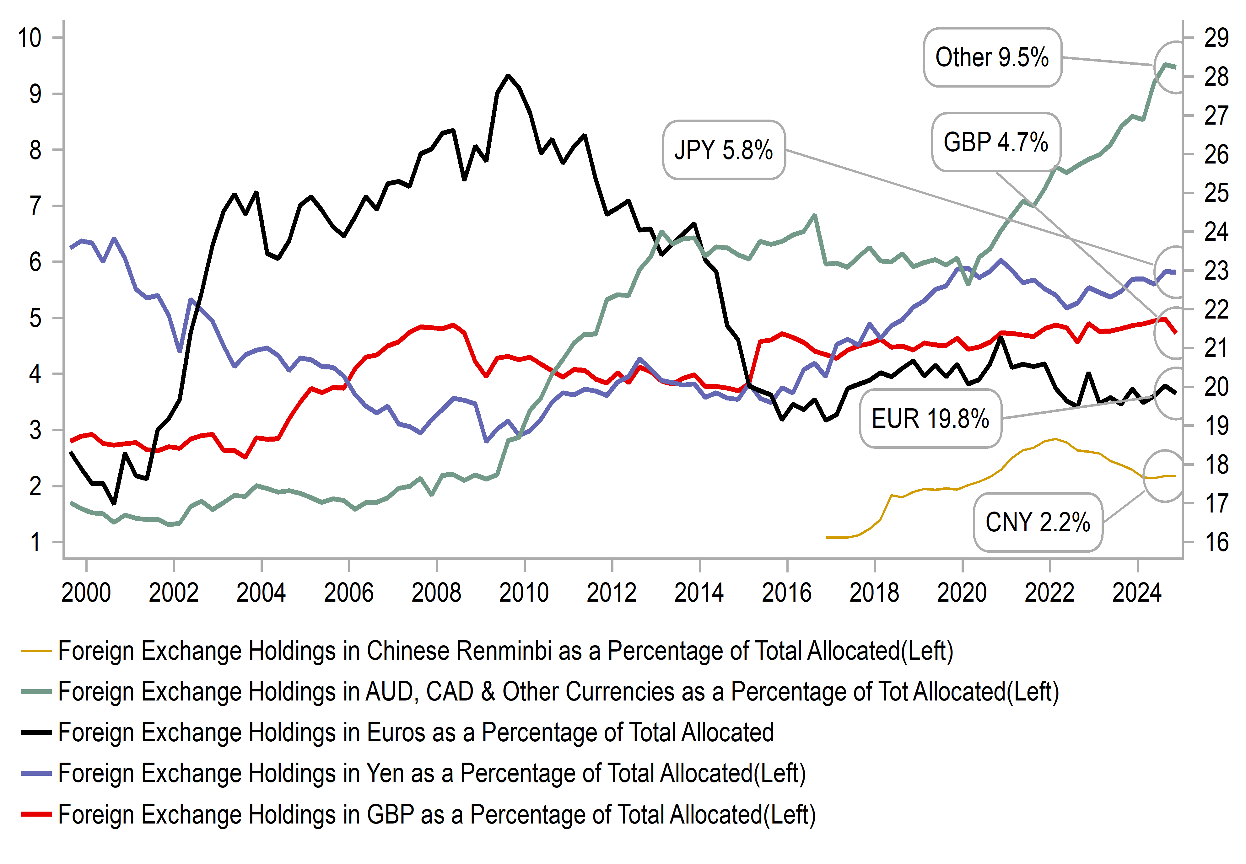 So while we are very sceptical of the view of the dollar losing its reserve status, that does not preclude the potential for dollar holdings to gradually decline further and we see EUR as best placed to take on a greater reserve currency status role.