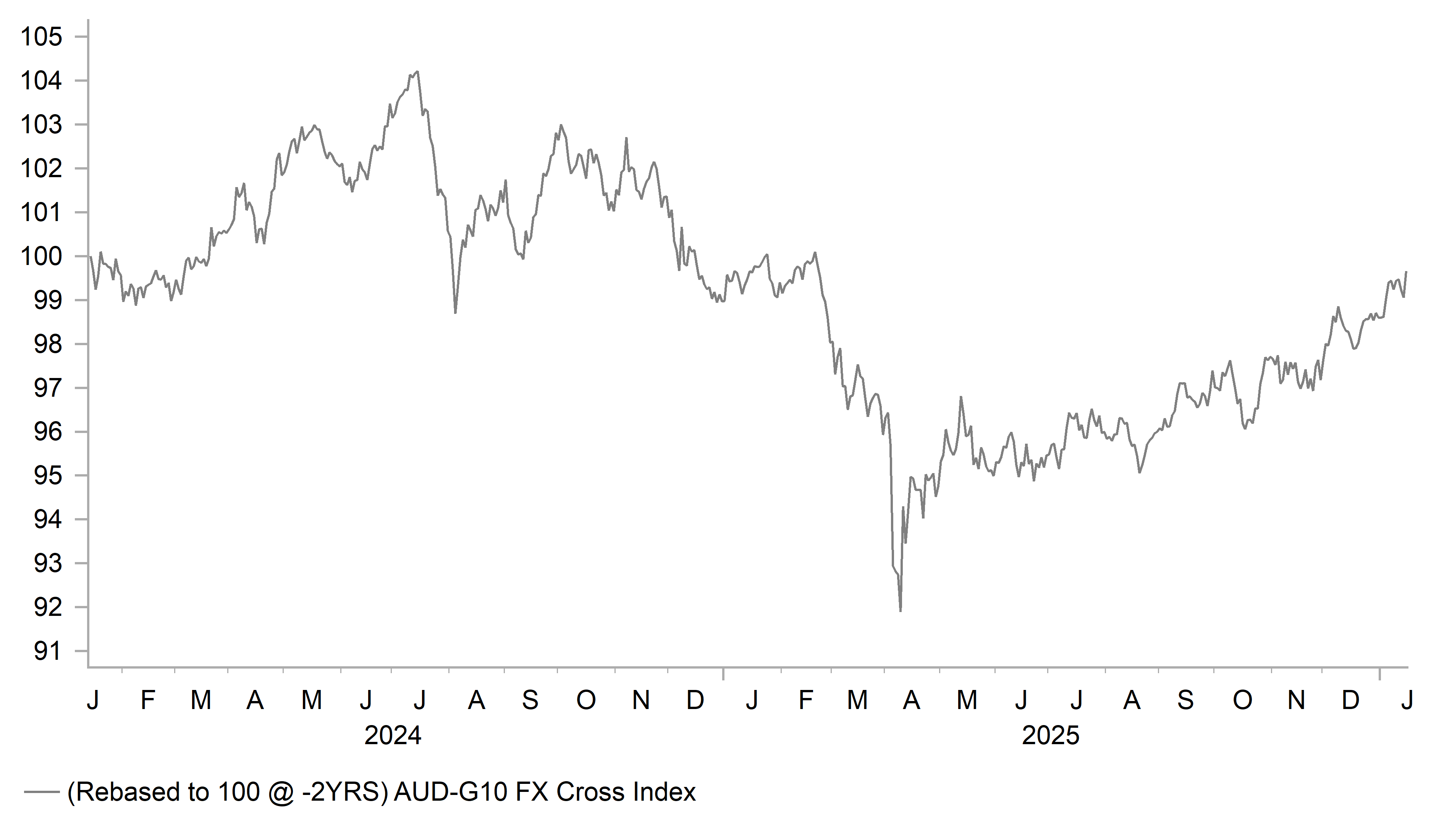 The US dollar advanced marginally last week (DXY 0.2%) with the euro the underperforming G10 currency. The dollar got a lift into the end of the week following President Trump’s comment suggesting Kevin Hassett is out of the running to be Fed Chair. The news over the weekend of fresh tariffs on European countries supporting Greenland has had limited FX impact with only modest dollar selling. Eyes this week will be on tariff developments and on Japan. Friday is when the Diet reconvenes and it is expected that PM Takaichi will immediately dissolve parliament and call a general election. Strong intervention rhetoric helped the yen last week but if the BoJ maintains a cautious tone to future rate increases we will likely see renewed yen selling. We also highlight the positive fundamental backdrop for the Australian dollar that points to further appreciation ahead. Tomorrow is also a scheduled Opinion Day for the US Supreme Court when we could possibly get a ruling on the legality of using IEEPA to implement reciprocal tariffs.