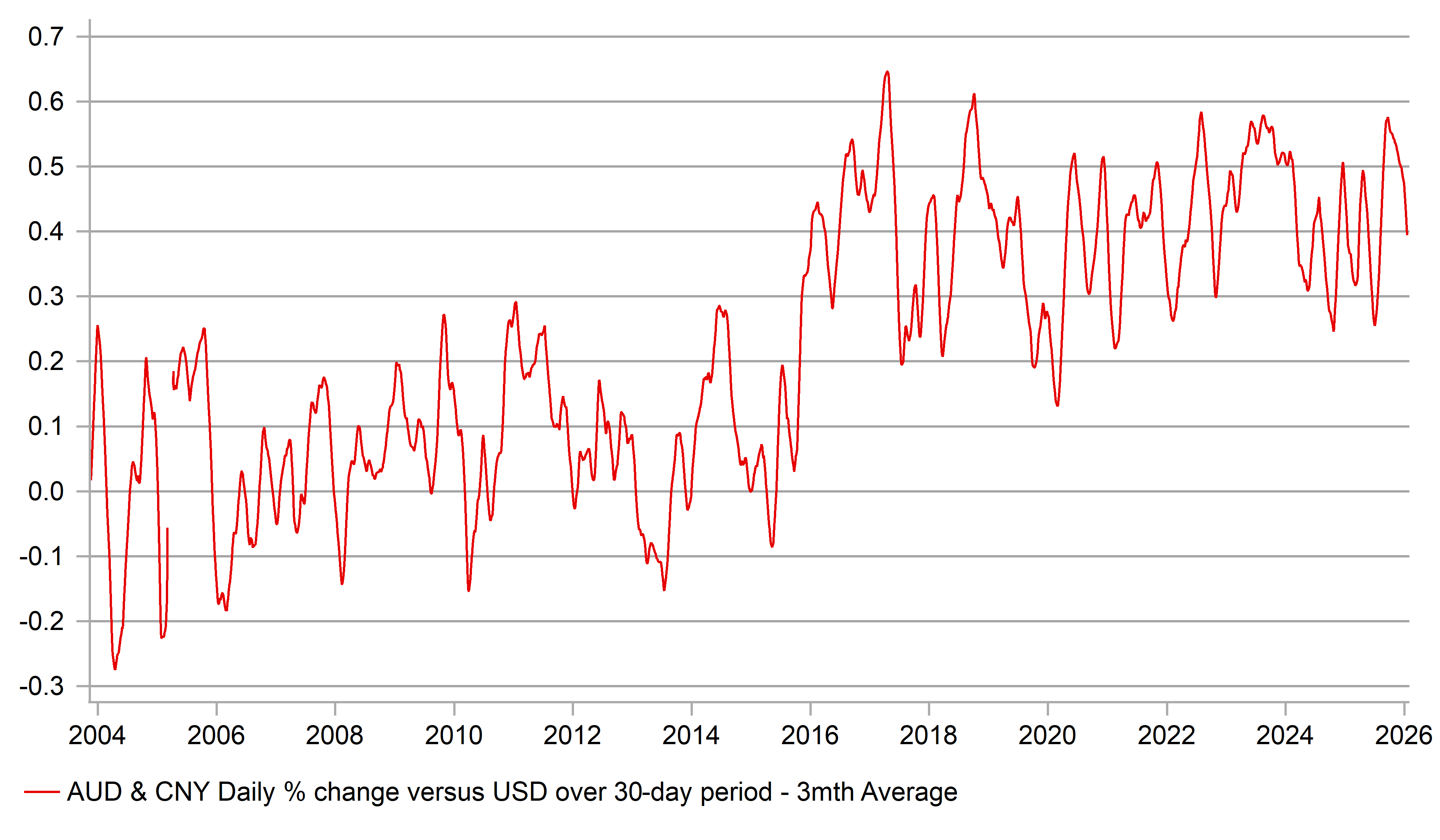 Another external factor supporting the AUD has been the paring back of concerns over downside risks to growth in China. The trade truce between China and the US was extended for a year in November. Over the past week, President Trump threatened to impose a 25% tariff on countries conducting business with Iran—a move that could potentially undermine the truce, given that China is Iran’s largest trading partner. Nevertheless, the latest trade data for December from China showed that it has adjusted better than expected to higher US tariffs, with China posting a record trade surplus of USD 1.19 trillion in 2025. While exports to the US fell sharply by –30.2% Y/Y in December, they were offset by stronger exports elsewhere, including to the EU (+11.5% Y/Y) and ASEAN economies (+11.3% Y/Y). Overall exports rose by +6.6% Y/Y. The reduction in trade‑disruption risks and the record surplus have encouraged Chinese policymakers to allow the CNY to strengthen, as reflected in USD/CNY breaking below 7.0000 at the start of this year. This development provides an additional tailwind for the AUD, given its positive correlation with the CNY. We expect the CNY to strengthen further in 2026, though at a slower pace than in recent months (click here). The escalation of tariff risks over the weekend related to Greenland could result in some trade disruptions, but this would be more Europe-focused and would be less of a risk to Australia than disruption in Asia.