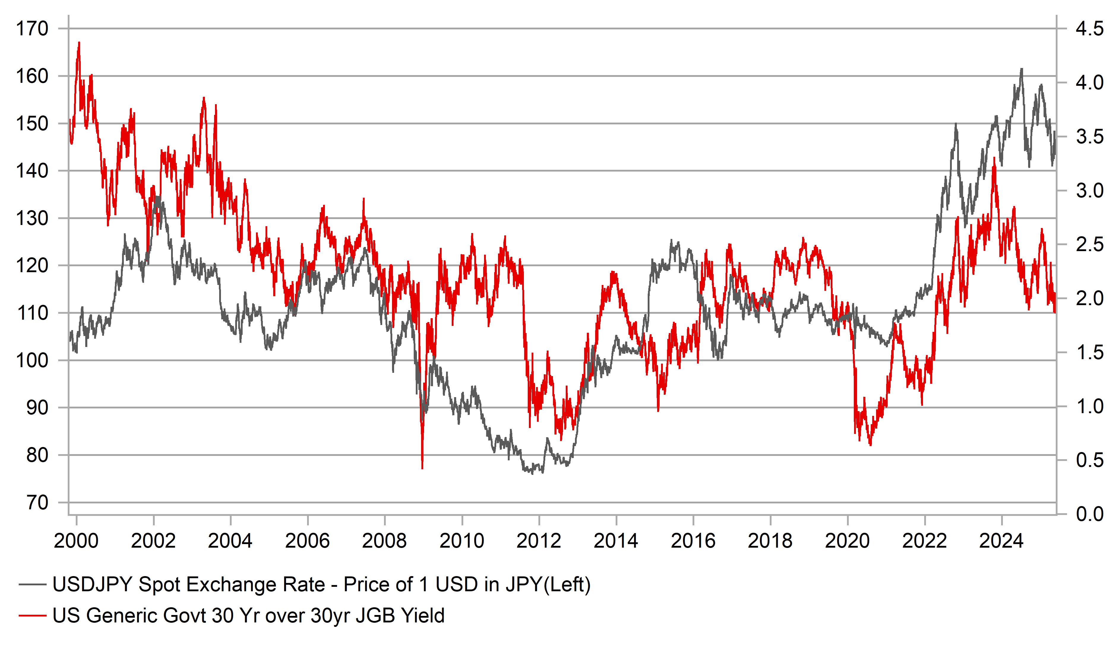 30-YEAR US-JAPAN GOVERNMENT BOND YIELD SPREAD POINTS TO DOWNSIDE USD/JPY RISKS