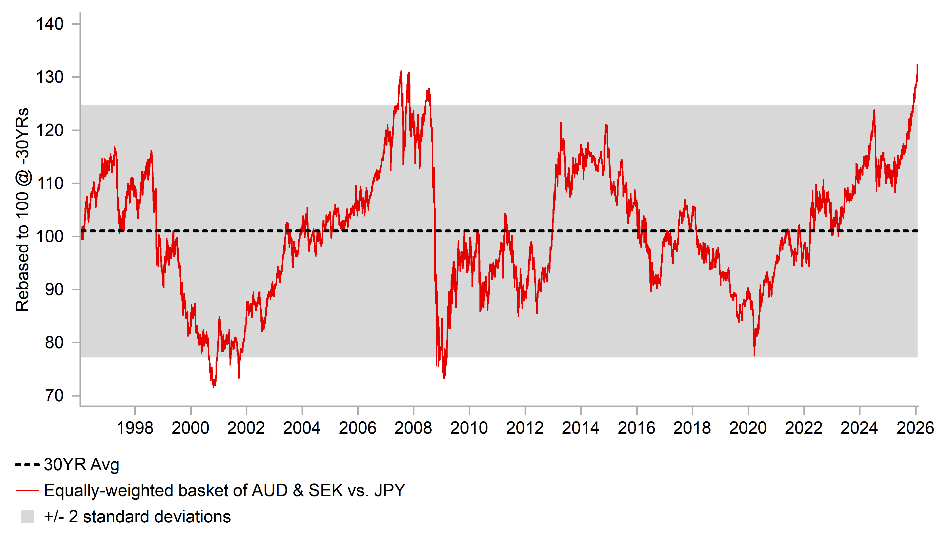 If the JPY continues to strengthen, market participants are likely to become increasingly wary of the risk of a more disruptive unwind of JPY‑funded carry trades, similar to what was seen between July and August 2024. On that occasion, the S&P 500 equity index fell by almost 10% as risk assets were hit hard by the rapid carry unwind. Such a development would threaten the recent outperformance of high‑beta carry currencies, including the AUD among G10 currencies, as well as emerging market currencies that have benefited from a weaker USD, rising commodity prices, and a backdrop of low financial market volatility.