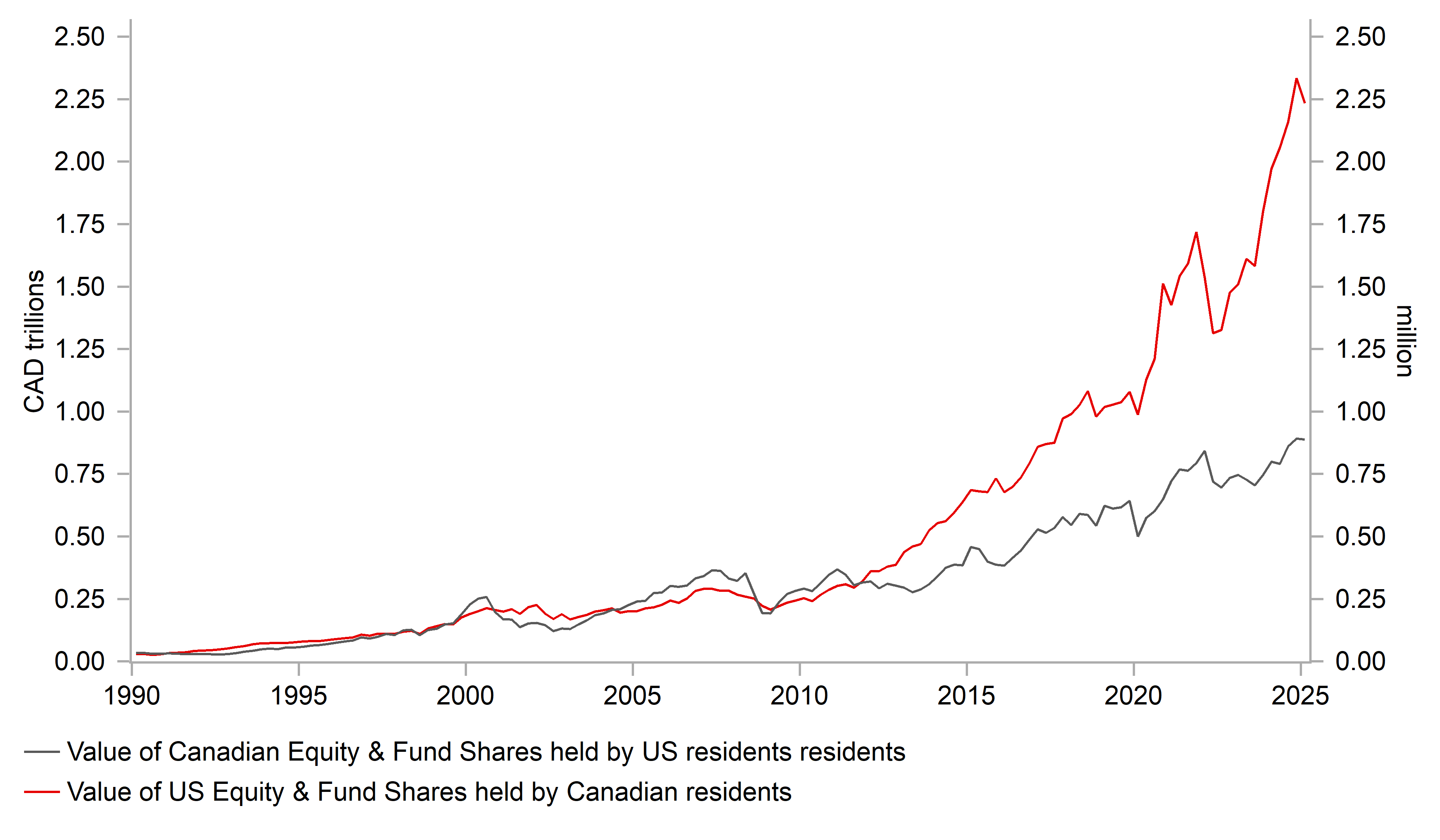 The latest update on Canada’s exposure to US assets was released earlier this month on 11th June. The International Investment Position report for Q1 revealed that Canada’s net foreign asset position with the US fell by CAD177.8 billion to CAD1,553.3 billion. It was driven by a significant decline in the value of both portfolio (CAD82.2 billion) and direct (CAD64.7 billion) investment assets in the US largely resulting from lower US equity prices in Q1. StatCan noted that the value of Canadian portfolio investment in the US (CAD2.96 trillion) has been greater than the value of US portfolio investment in Canada (CAD1.96 trillion). The net portfolio investment position with the US reflects a net asset position in equity securities (CAD1.34 trillion) partially offset by a net liability position for debt securities (CAD338 billion). The increase in the net portfolio investment position with the US since the end of 2019 has been driven by equities especially in recent years when Canadian holdings of US equities have grown substantially. The value of US equity & investment fund shares held by Canadians has increased to CAD2.23 trillion in Q1 2025 up from CAD1.08 trillion in Q4 2019. It equates to around 72% of GDP in Q1 2025 compared to around 47% of GDP in Q4 2019. The potential for increased hedging flows to mitigate for the risk of the USD weakening further could continue to weigh down on USD/CAD which has already returned back to the mid-1.3000’s where it was trading between Q4 2022 and Q3 2024.