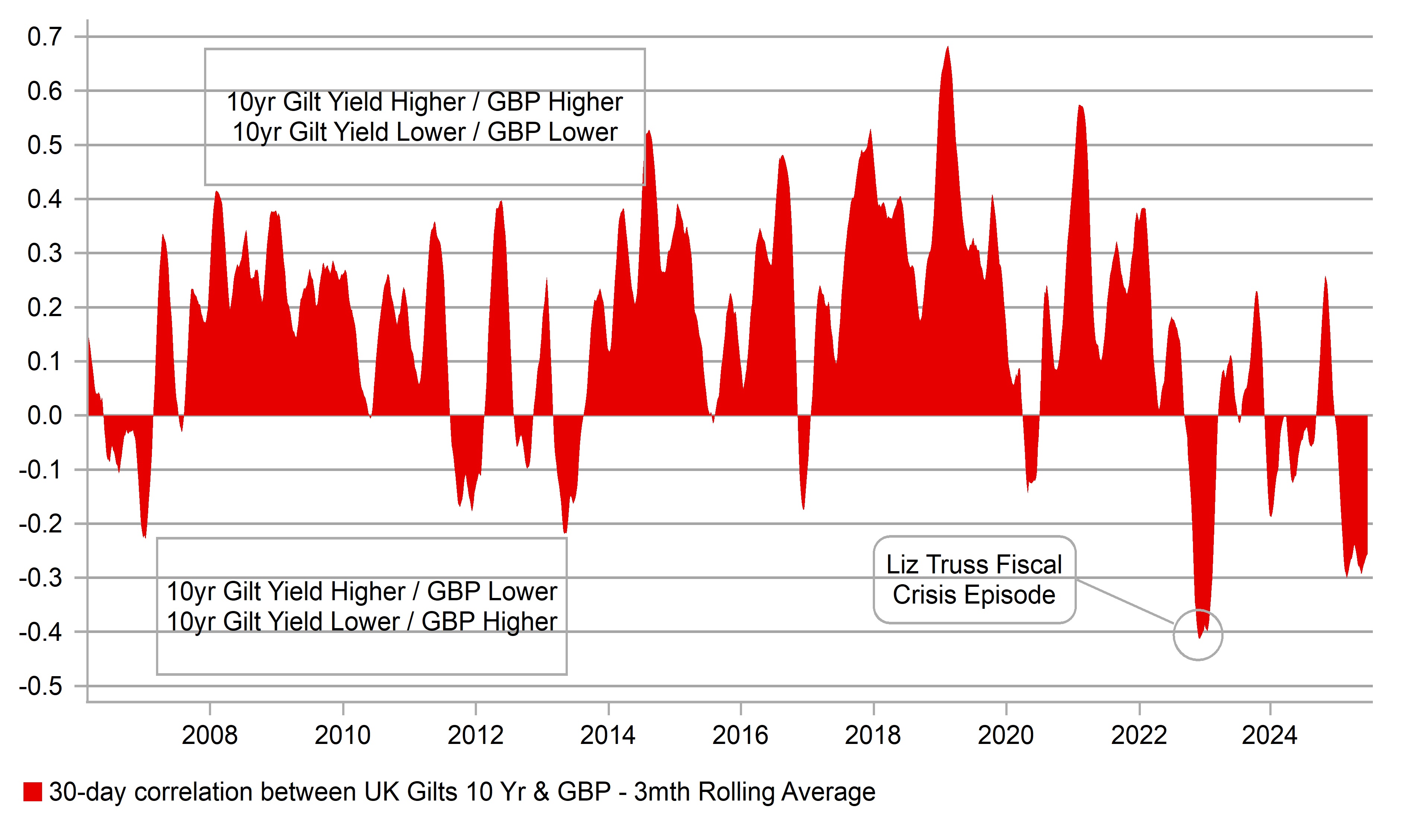 PM Kier Starmer has had to bat away a major party rebellion by removing some of the benefit cuts that had been pencilled in and schedule to be voted on in parliament. The Resolution Foundation estimates the net cost to be potentially GBP 3bn and follows a u-turn in the winter fuel allowance at a cost of GBP 1.5bn. The combined cost of these u-turns makes it increasingly likely that Chancellor Reeves will have to raise taxes in the autumn budget. Current GBP/Gilt yield correlations are negative so undermining fiscal credibility could fuel GBP selling (chart below). Governor Bailey this week repeated the MPC view that there is “strong evidence of labour market slack opening up”. While we maintain our view of a quarterly pace to MPC rate cuts, further labour market weakness will increase the prospect of back-to-back rates cuts in August and September with the BoE also now hinting at the chance of a cut to the pace of QT to help cap long-term Gilt yields.