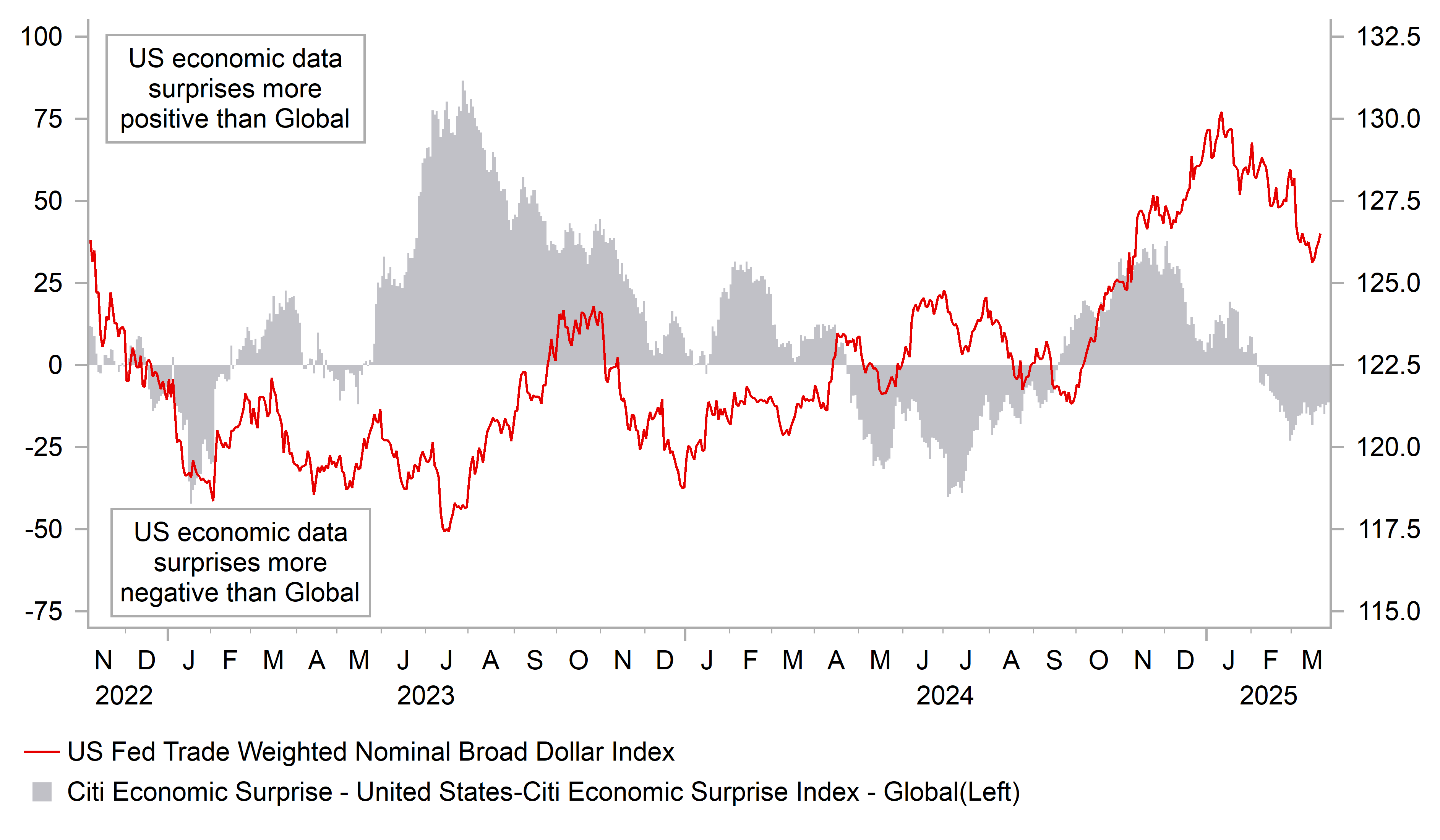 The US dollar has weakened against most G10 currencies this week but for most currencies the moves have been contained ahead of the key risk-event next week – the reciprocal tariff announcements on 2nd April. There has been a clear pattern of less and less market reaction to Trump tariff announcements but this may simply reflect difficulty trading the announcements given the uncertainty over the longevity of announcements. There is also we believe a degree of optimism over the scale of tariffs with expectations of exemptions and carve-outs diluting the negative macro impact. However, we see a high chance of very broad-based tariffs with more aggressive action on countries which the US runs larger trade deficits. G10 central bank rate expectations could well adjust to price more cuts that would help propel the dollar stronger for a period. However, FX is a relative price and US growth expectations have declined and with DOGE actions not yet clear, there will be limits to the scale of dollar strength over the short-term before we see renewed depreciation in second half of this year as Fed easing resumes.