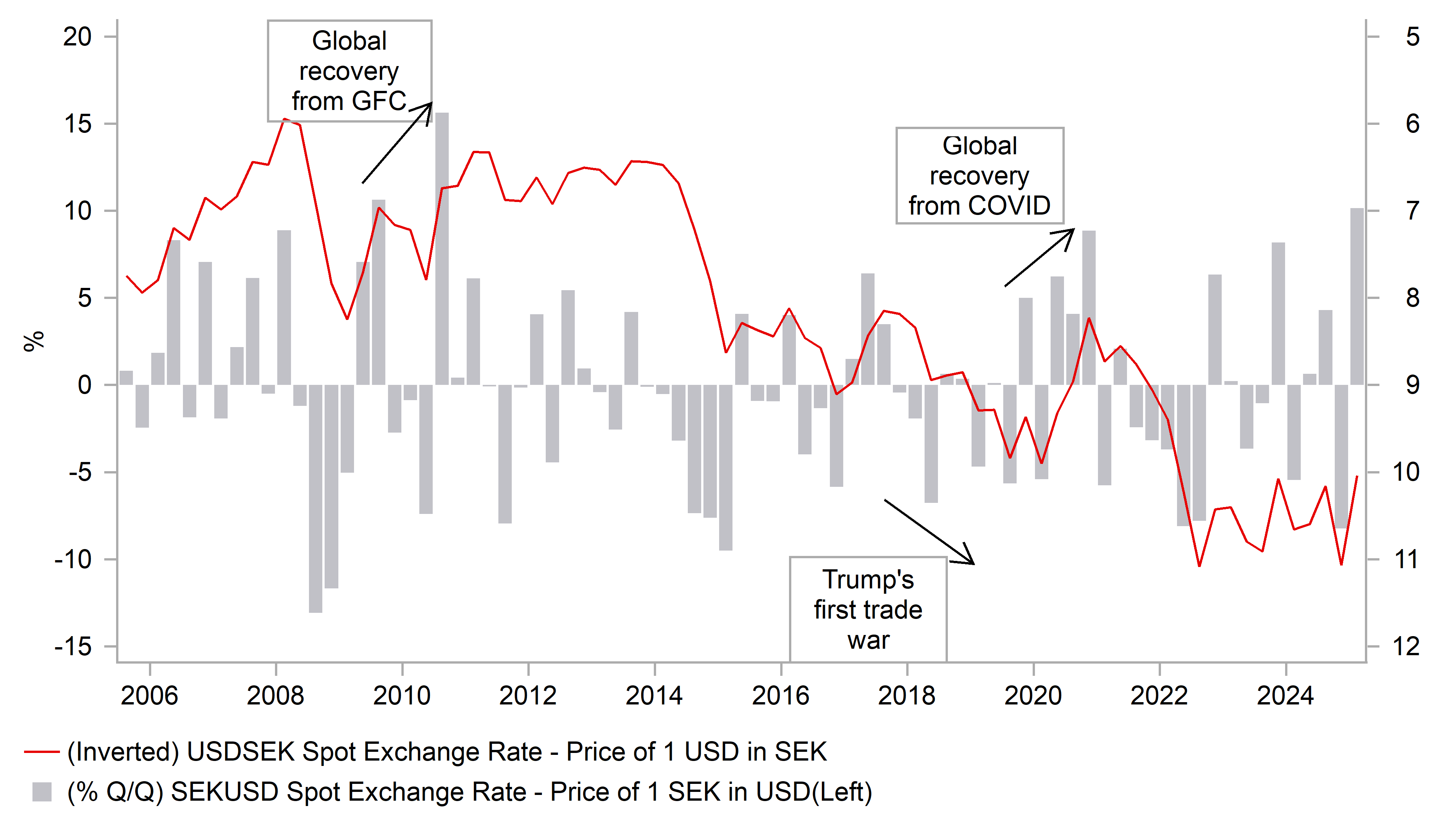 The main downside risks for the SEK that could trigger a setback after recent outsized gains would be the emergence of evidence revealing that heightened policy uncertainty and tariff disruption at the start of President Trump’s second term is having a bigger dampening impact on global growth. Sweden is a small and open economy (exports account for around 55% of GDP) which makes the SEK sensitive to global trade developments. The announcement this week of US plans to implement 25% tariffs on imports of autos and certain auto parts will add to those downside risks going forward especially the longer those tariffs remain in place. Next week’s US “reciprocal tariffs” plan could further increase the risk of a more disruptive global trade war. Sweden would be negatively impacted both directly and indirectly by tariffs imposed on the EU.