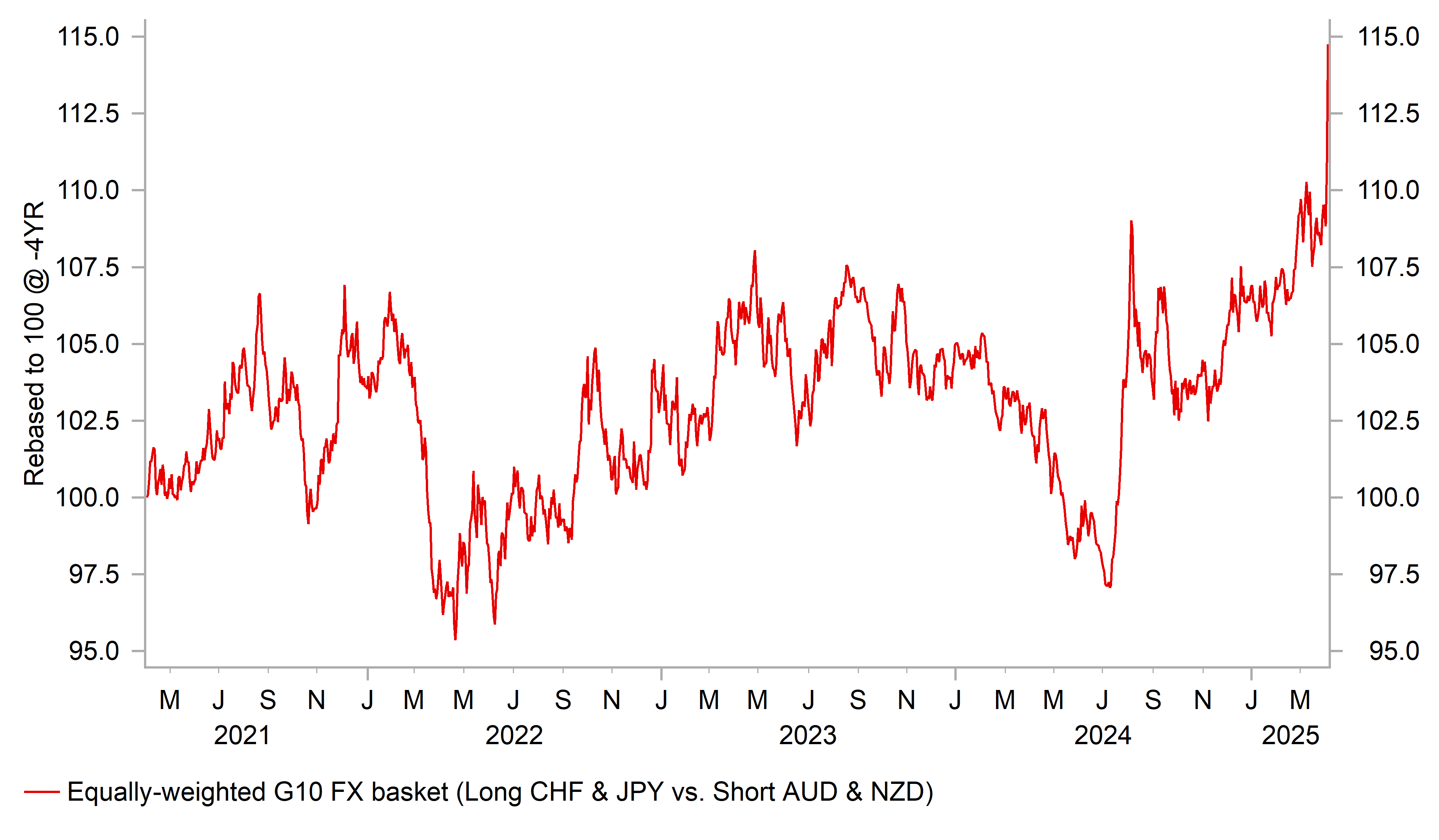 weakness could reflect a number of factors including: i) building expectations for a more stagflationary outcome for the US economy which is bringing down real yields in the US, ii) a further unwind of popular positions built up in US assets as US exceptionalism trades continue to unwind, and iii) a broader loss confidence in policy making in the US that is undermining confidence in the USD and US assets as the Trump administration lashes out at the rest of the world. Finally, the maximalist US tariff approach could play into speculation that it is part of the grand plan to set up a “Mar-a-Lago” Accord to force trading partners to work with the US to devalue the USD. Our colleagues in Capital Market Strategy (click here) provided a summary of what it could entail. We remain sceptical that other trading partners would all agree through force to weaken the USD and to a US debt swap, but acknowledge such speculation can impact market sentiment towards the USD. Stephen Miran told Market News yesterday that a “Mar-a-Lago” accord is “not currently in the works”.