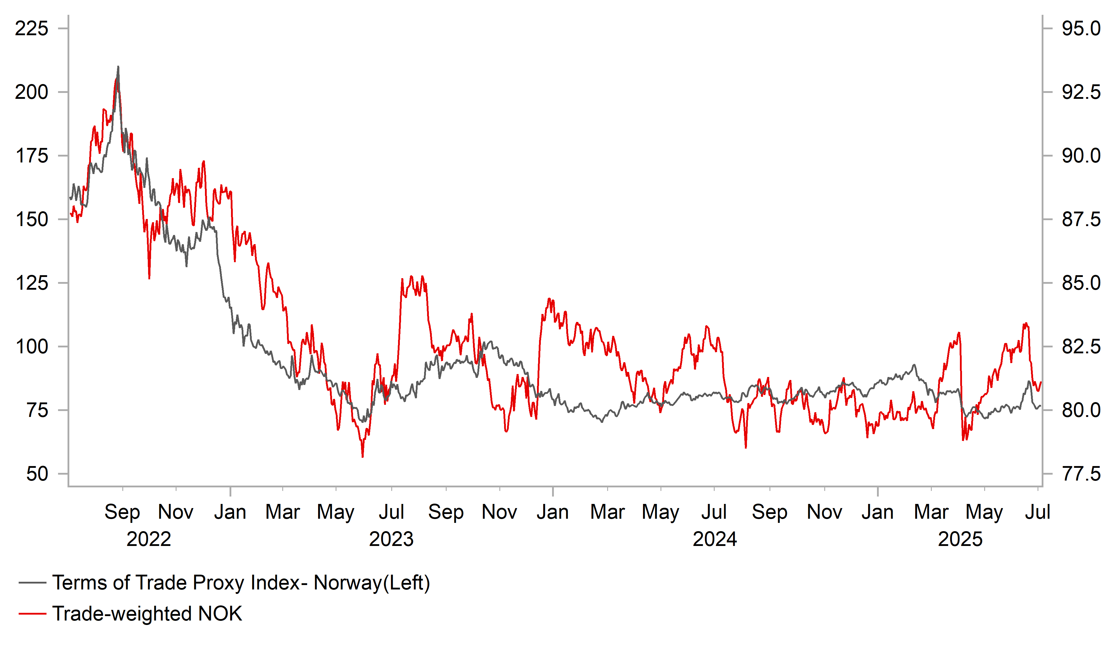 After the strong start to the year both Scandi currencies have recently lost upward momentum. Given broad-based USD weakness, the loss of upward momentum for NOK and SEK is more evident against the EUR. EUR/SEK hit a low of 11.665 in April but has just risen back above resistance from the 200-day moving average at around the 11.200-level. Similarly, EUR/NOK hit a low of 11.261 in April and has since risen back above the 11.800-level closer to where it has been trading over the past year. The turning point for both EUR/SEK and EUR/NOK was President Trump’s Liberation Day tariffs announcement in early April. Even though global investor risk sentiment has improved significantly since the worst point in April, it has been notable that both the NOK and SEK have been unable to regain their prior bullish momentum.