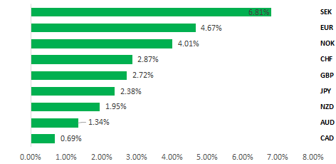 It has been a volatile week for the CAD. At the start of the week USD/CAD hit of 1.4543 on Tuesday after President Trump’s tariff hikes (click here) on imports from Canada became effective from 4th March. The pair has since reversed the initial move higher and has fallen back towards last month’s lows at closer to the 1.4200-level. Despite gains in recent days the CAD has still underperformed this week alongside the USD when it has been the second worst performing G10 currency. It has significantly underperformed European G10 currencies weakening by -5.5% against the SEK, -3.4% against the EUR and -2.8% against the NOK.