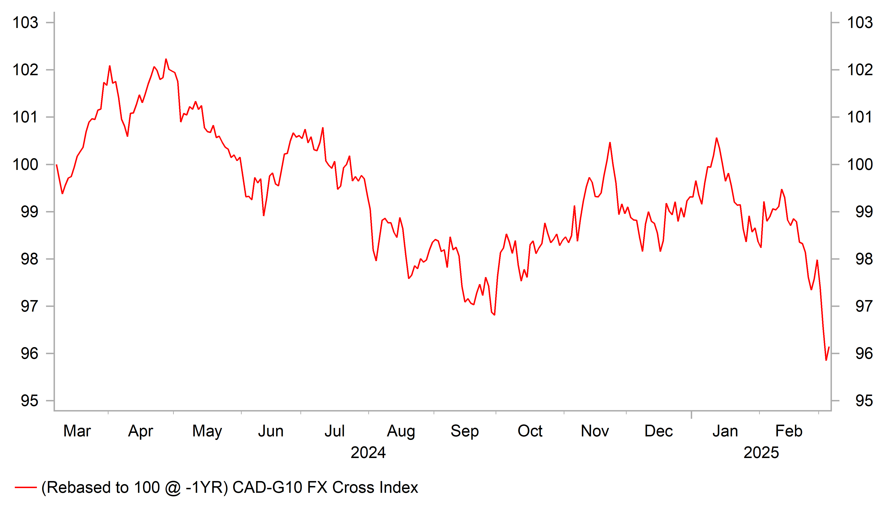 The negative economic fallout from heightened trade policy uncertainty and higher tariffs will increase pressure on the BoC to lower rates further next week. We expect the BoC to deliver another smaller 25bps cut although the return of larger 50bp cuts can’t be ruled out in the coming months if the trade war escalates further and Canada’s economy slows more sharply than expected. The BoC’s current estimate of the neutral policy rate is between 2.25% and 3.25%. Heightened downside risks to growth from trade disruption will offset recent positive Canadian data releases revealing economic growth was stronger than expected last year. Real GDP expanded more strongly than expected by 2.6% in Q4 and growth in Q3 was revised significantly higher by 1.2 percentage points to 2.2%. Growth at the start of this year was initially boosted as well by the front-running of Trump’s tariffs that lifted Canada’s exports. Total exports increased by 5.5%M/M in January and by 7.5% to the US. As a result, Canada’s trade surplus with the US hit a new record high of CAD14.4 billion. So far Canada has imposed only modest retaliatory tariffs of 25% on CAD30 billion of US imports from 4th March, and plans to step up to cover a further CAD125 billion of US imports within 21 days. We expect the BoC to put more weight on the disinflationary impact from weaker growth rather than the inflationary impact from retaliatory tariffs. In these circumstances, we expect the CAD to continue to underperform in the near-term.