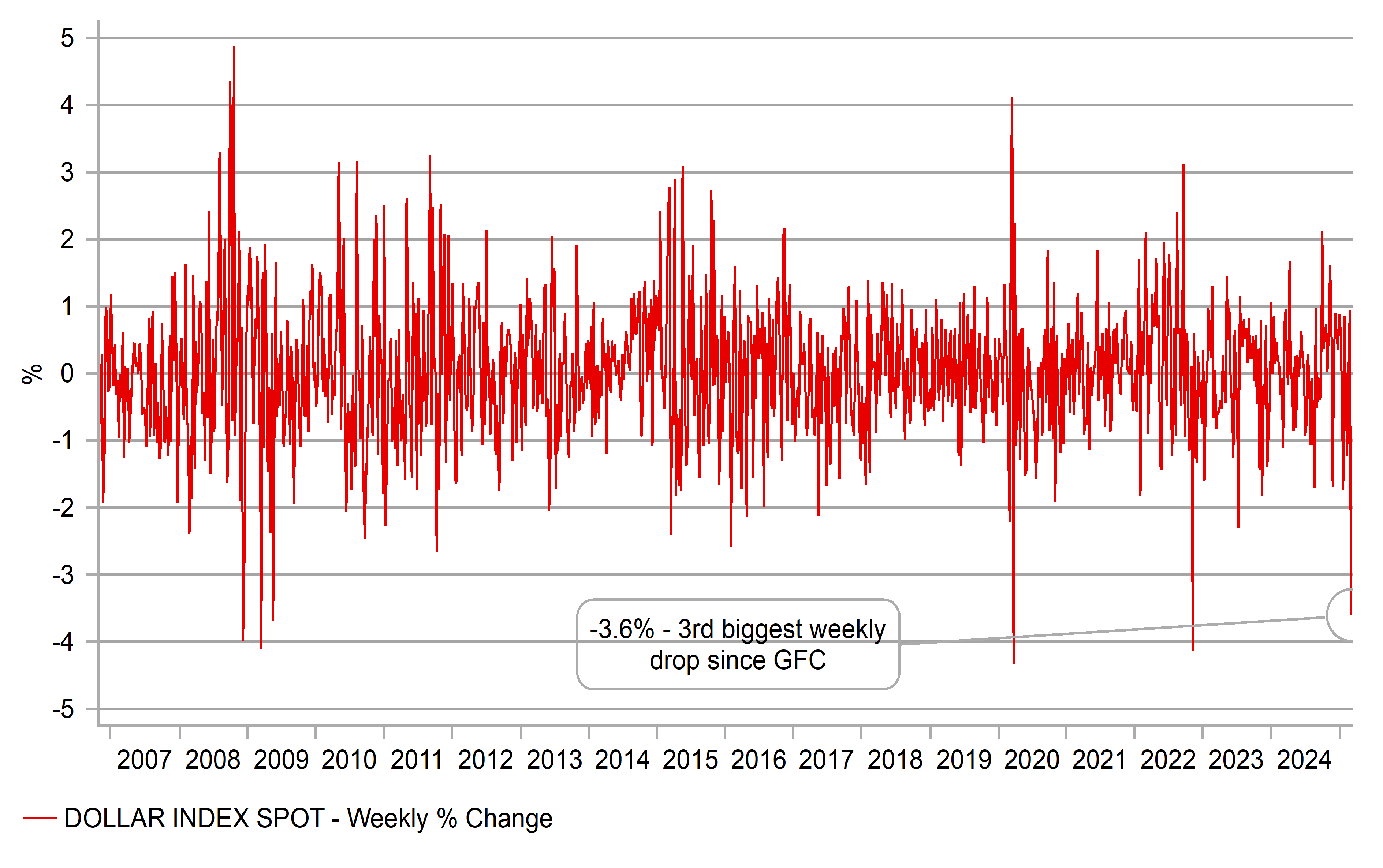 The US dollar this week has had a move that happens very rarely – a drop of between 3.5%-4.0% is the largest decline for the dollar since November 2022 when lower than expected inflation data triggered a 4.1% drop. Previous to that the dollar fell 4.3% during the covid turmoil in March 2020. In 2022 it was significant in signalling a further 5% drop over the following two months. In 2020 markets were more volatile but still also signalled a more sustained turn with the dollar extending 5% further lower but over a 4-month period and by 9% by the end of 2020. Looking back beyond those two more recent big weekly declines for the US dollar you have to go back to the Global Financial Crisis and the turmoil in 2009 to see the scale of declines we have had this week. So from a historic perspective this week’s move is now very significant.