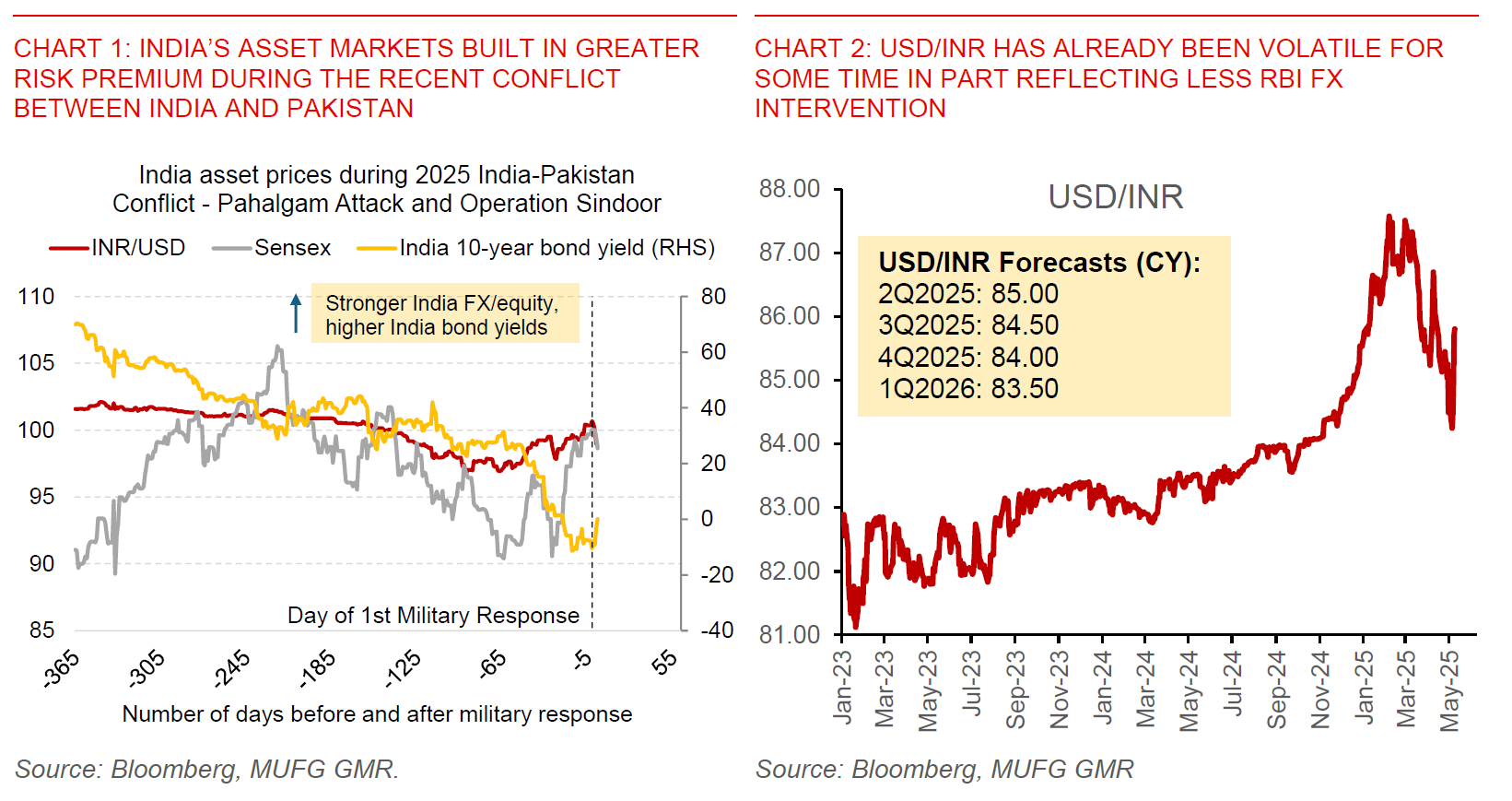 - Our existing USD/INR forecast profiles of 85.00 by 2Q2025 (calendar year) and 83.50 by 1Q2026 (calendar year) do not build in an implicit forecast of a meaningful and sustained escalation in conflict between India and Pakistan, even as we are cognisant of the left tail risks from the current conflict.
