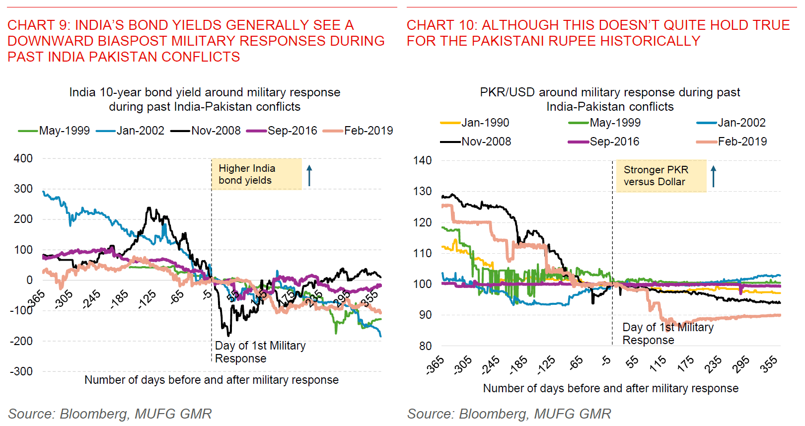 - Our analysis of the history of India-Pakistan conflicts suggests that the market impact (including on USD/INR) tends to be relatively short-lived especially in the post 1999 Kargil War episodes (see Charts 7 to 10 below). From a cross-asset perspective, this is also true for India’s equity and bond markets, with equity markets generally recovering 12 months after the 1st military response and India’s bond yields generally on a downward trend.
