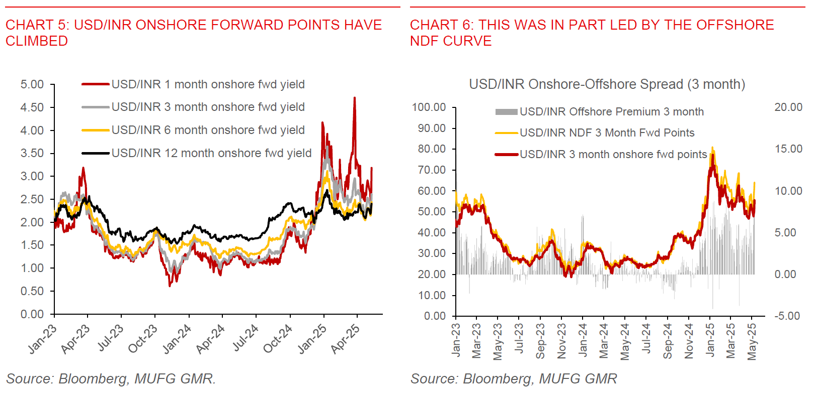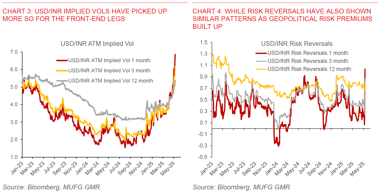 - From a FX market perspective, the India Pakistan conflict has resulted in INR weakening against the Dollar to 85.80 from recent local lows of 84.00 and underperforming Asian currencies to some extent as geopolitical risk premium was priced in. Meanwhile, USD/INR FX implied volatility picked up, much more so for the near legs, while risk reversals (ratio of calls to puts) also saw similar increases. Onshore forward implied yields also rose, with NDF points building in some greater risk premia with wider onshore-offshore spreads in USD/INR.