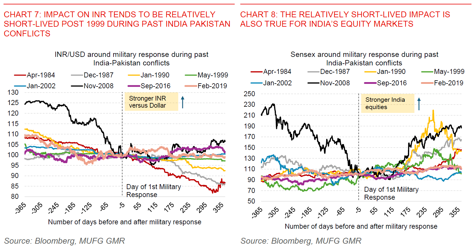 - Our analysis of the history of India-Pakistan conflicts suggest that the market impact (including on USD/INR) tends to be relatively short-lived especially in the post 1999 Kargil War episode. Nonetheless, we highlight that history is an imperfect proxy and this time could well be different.