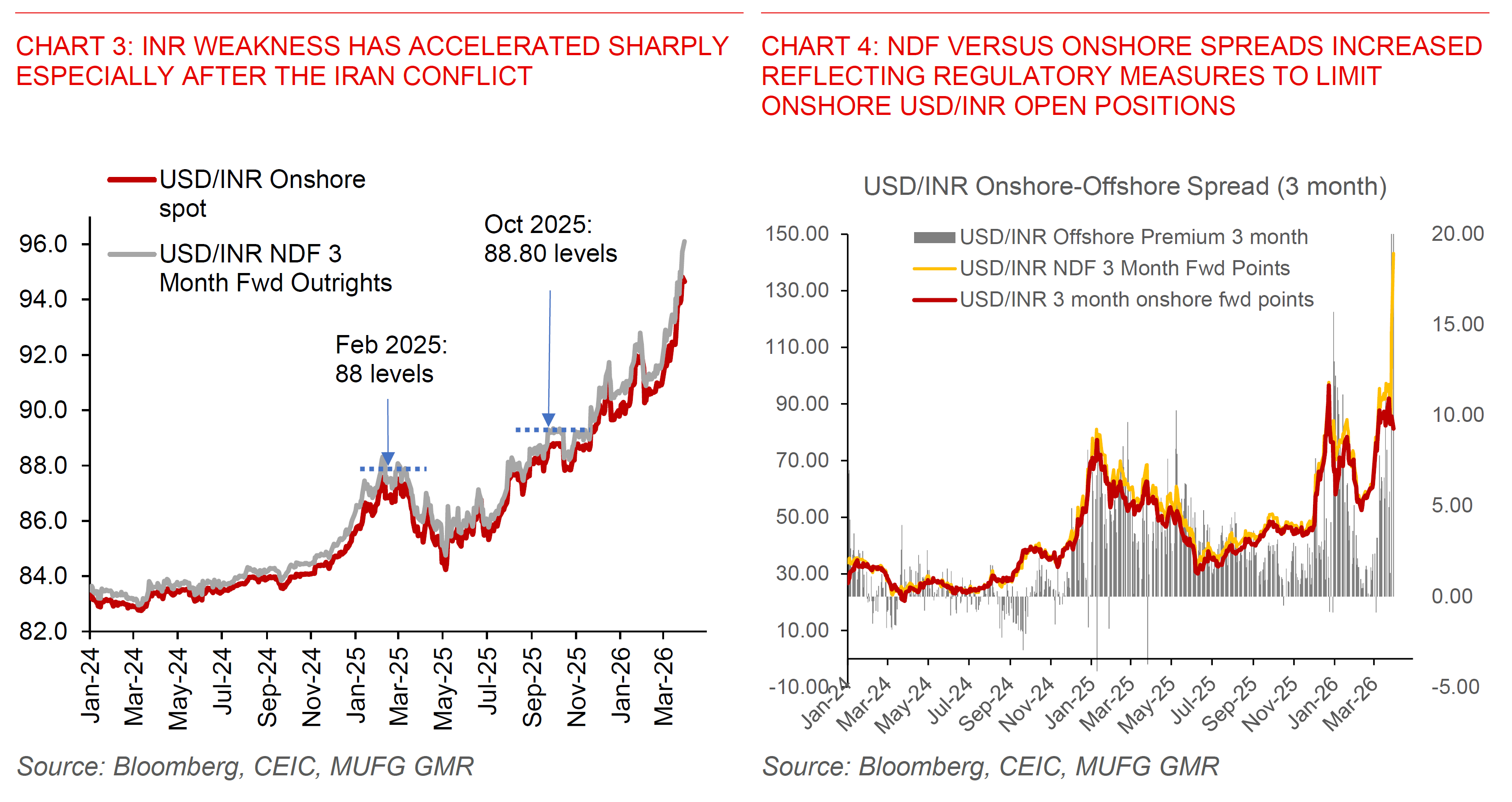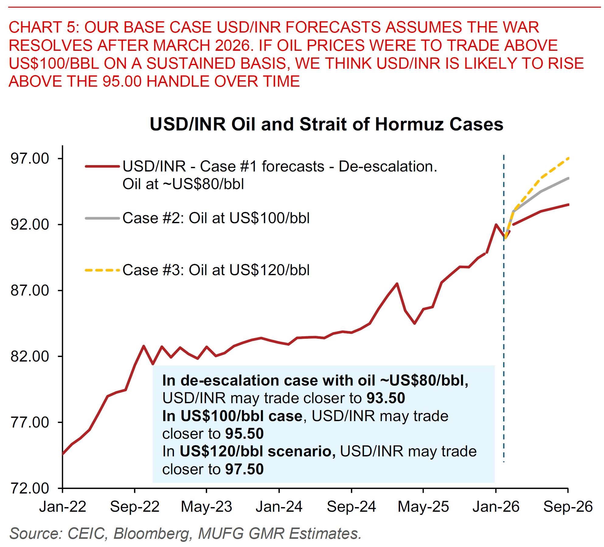 - Overall, we continue to see INR as vulnerable and likely rising above the 95 levels if the Iran conflict is prolonged and oil prices continue to rise from the Strait of Hormuz closure. As we pointed out, this time around it’s not just about oil prices but also energy shortages, coupled with indirect effects including higher fertiliser and food prices, weaker remittances, disruption to travel and transportation, coupled with weaker trade with the Middle East for India (see India – Strait of Hormuz closure: Not just about oil prices for INR).