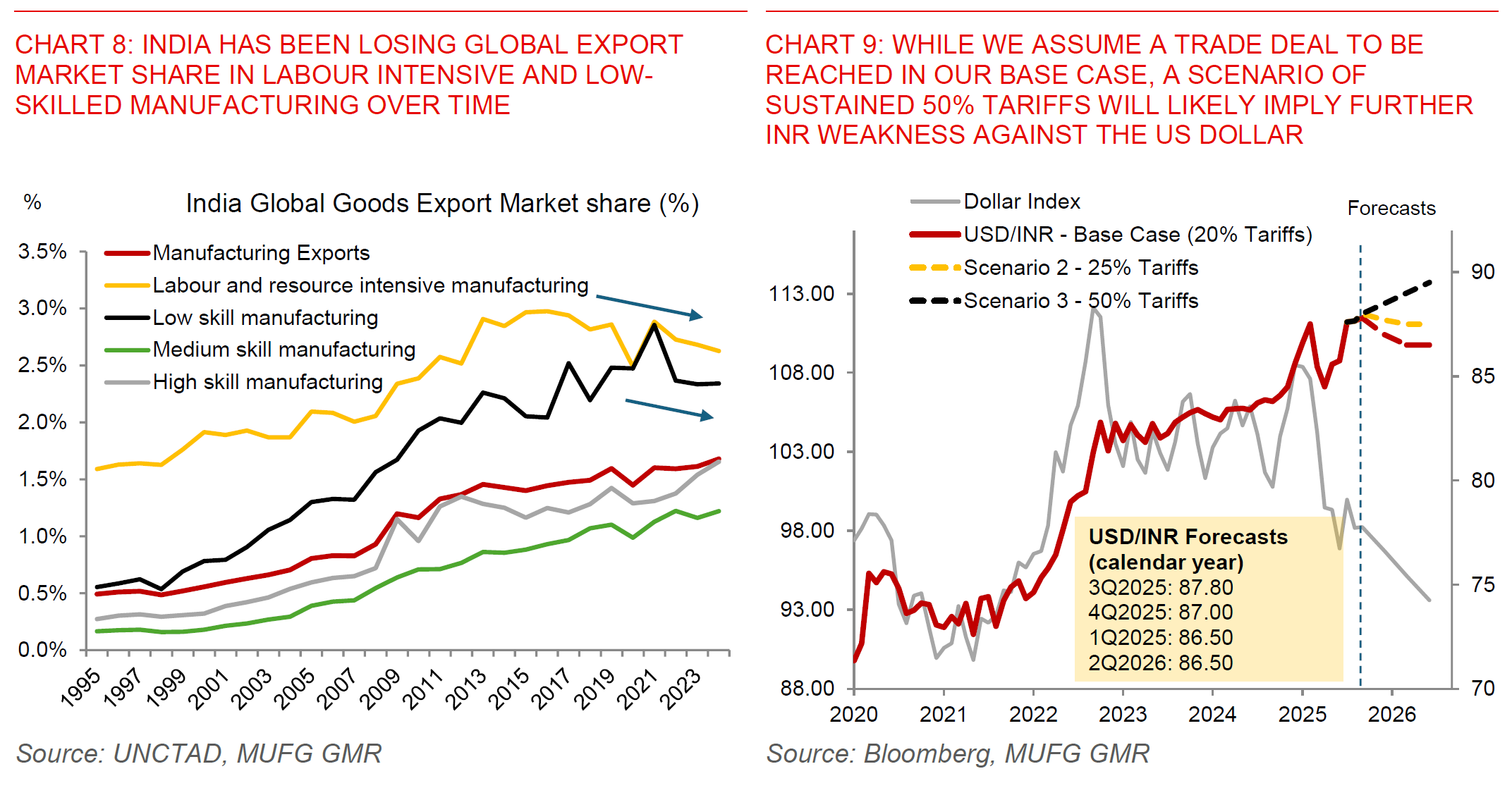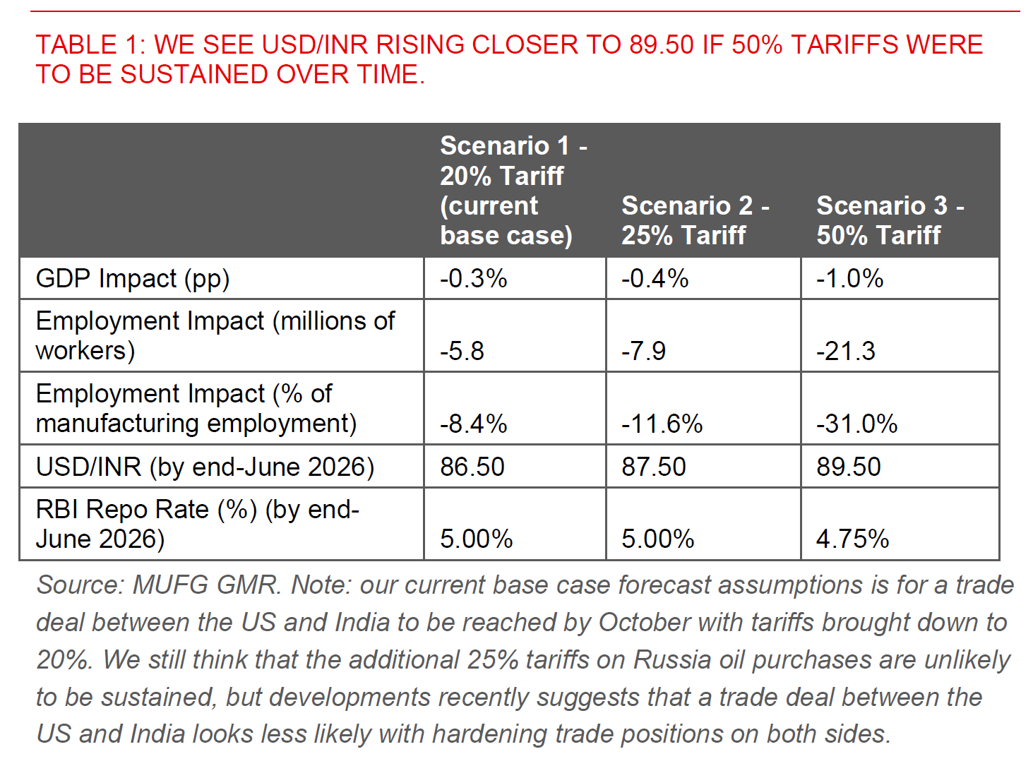 - If tariffs of 50% were to be sustained, we see USD/INR rising closer to 89.50 levels by June 2026, implying outright INR underperformance against major currency pairs including Asian FX (see Table 1 below).