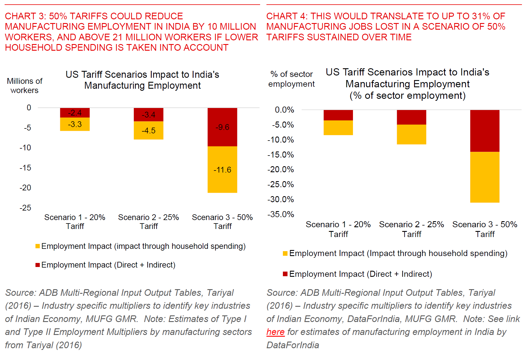 - Second, we find potentially significant negative effects on India’s labour market. A 50% tariff could reduce manufacturing sector employment by 10 million workers over time, and above 21 million workers if we take induced effects through lower household spending into account (Chart 3 above). This would equate to a meaningful 14% of India’s manufacturing employment directly lost and up to 31% on the high end if one includes indirect effects. Many of these workers are very likely also in the informal sector and so social safety nets are correspondingly less robust to begin with.